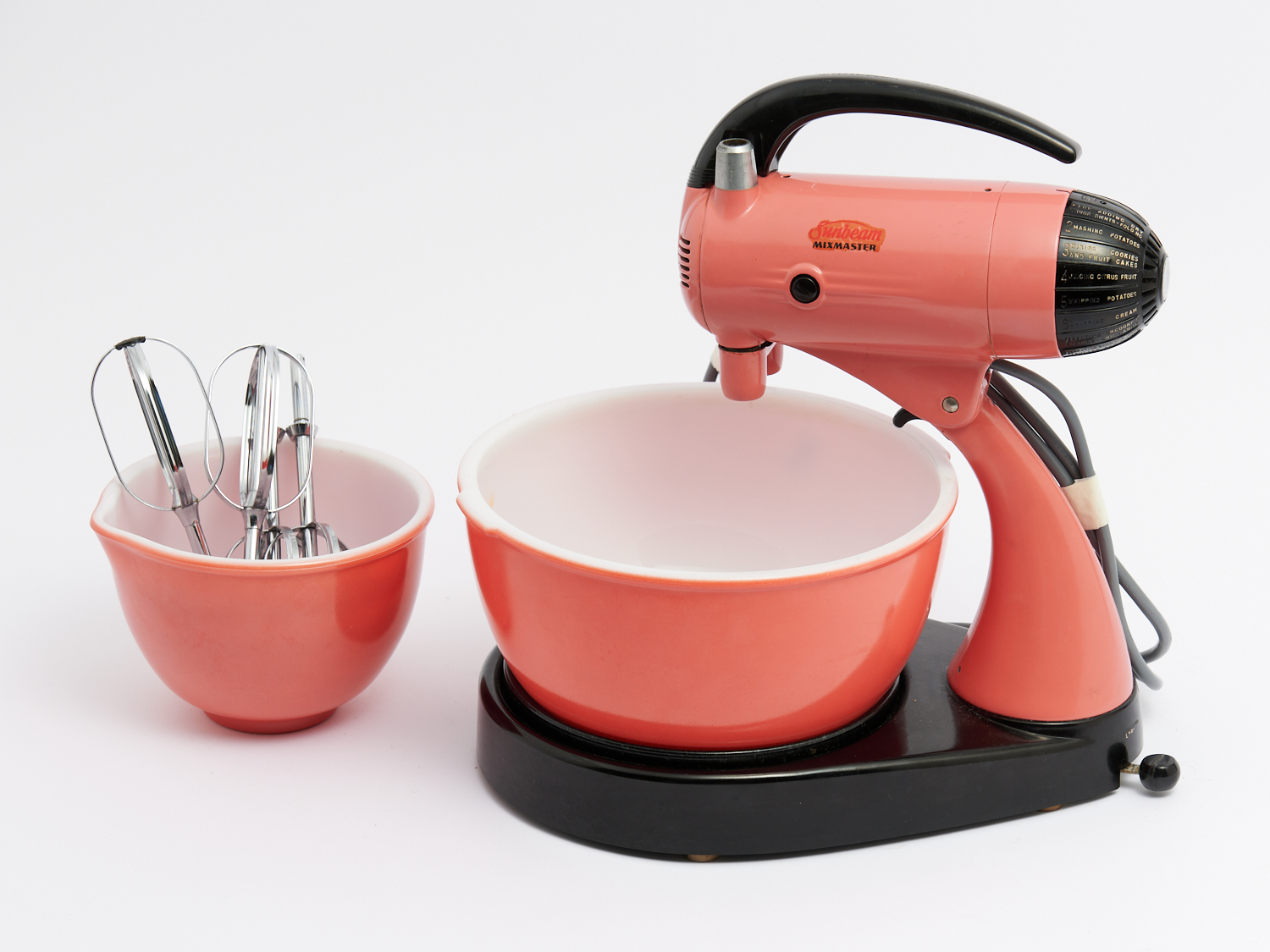 A VINTAGE FLAMINGO PINK SUNBEAM MIXMASTER WITH TWO BOWLS AND ORIGINAL INSTRUCTIONS H.34CM, LEONARD JOEL LOCAL DELIVERY: MEDIUM