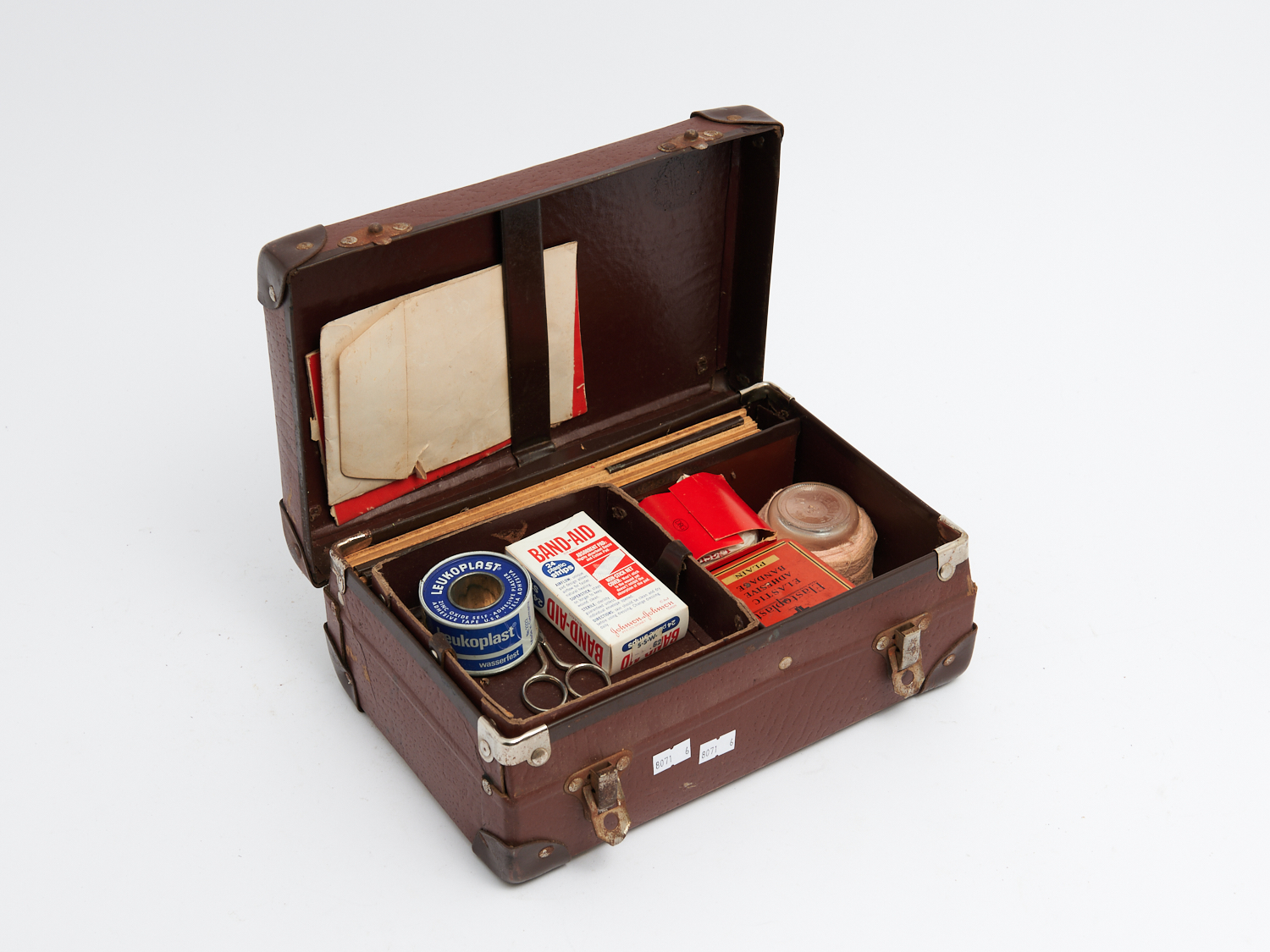 A 1950'S SANAX FIRST AID KIT WITH CONTENTS W.29CM, LEONARD JOEWL LOCAL DELIVERY: SMALL
