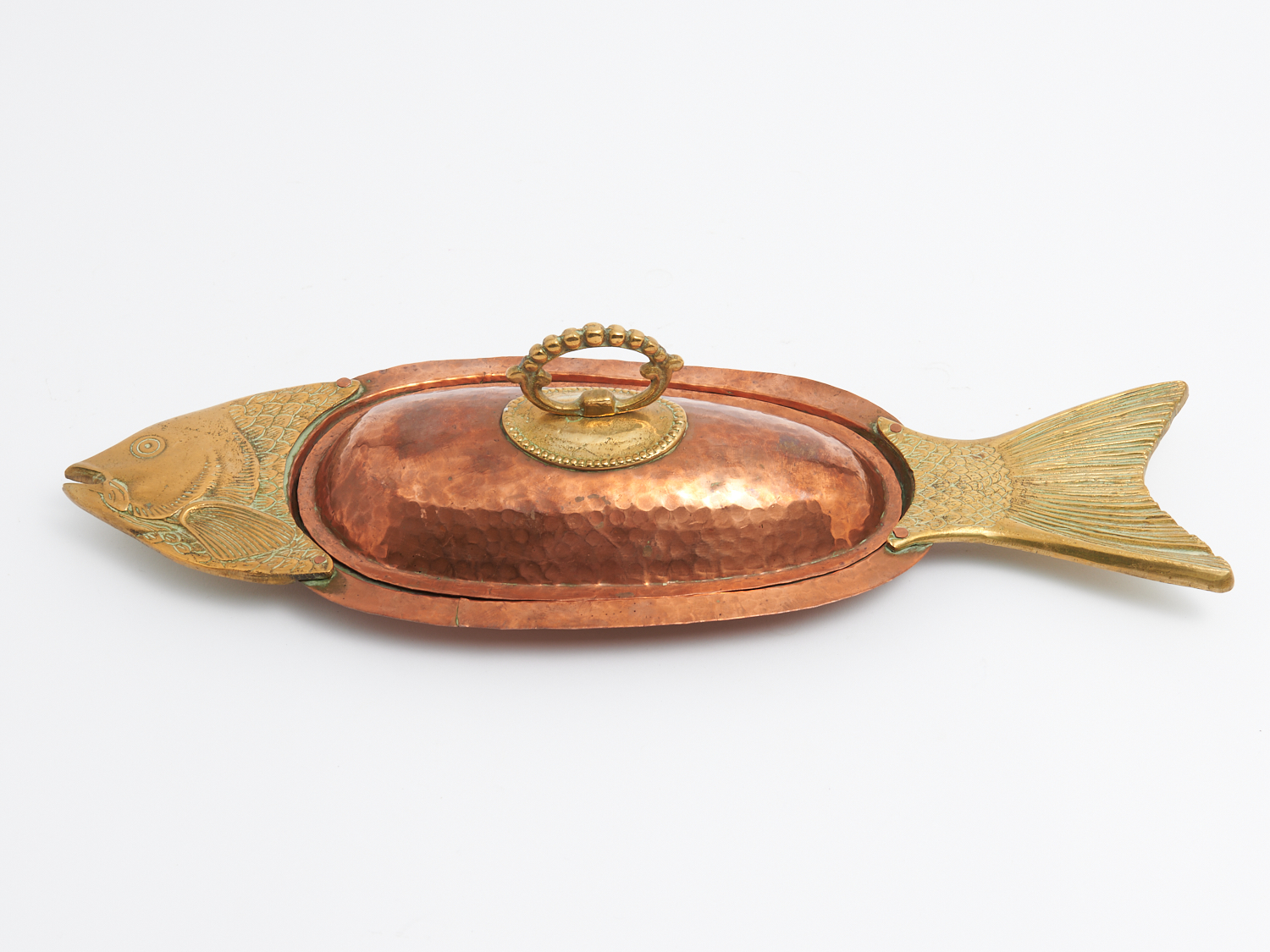 A FRENCH COPPER AND BRASS FISH FORM LIDDED CASSEROLE DISH L.50CM, LEONARD JOEWL LOCAL DELIVERY: MEDIUM