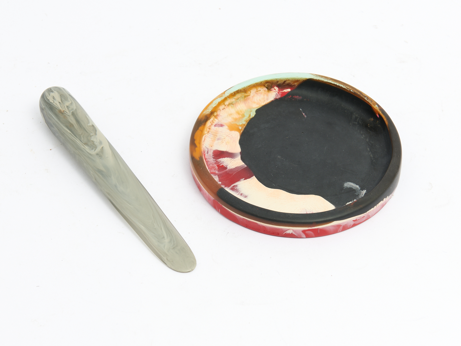 A SIGNED AND STAMPED AUSTRALIAN DINOSAUR DESIGN GREY AND WHITE PLATE WITH CHEESE KNIFE L.19.5CM, LEONARD JOEWL LOCAL DELIVERY: SMALL