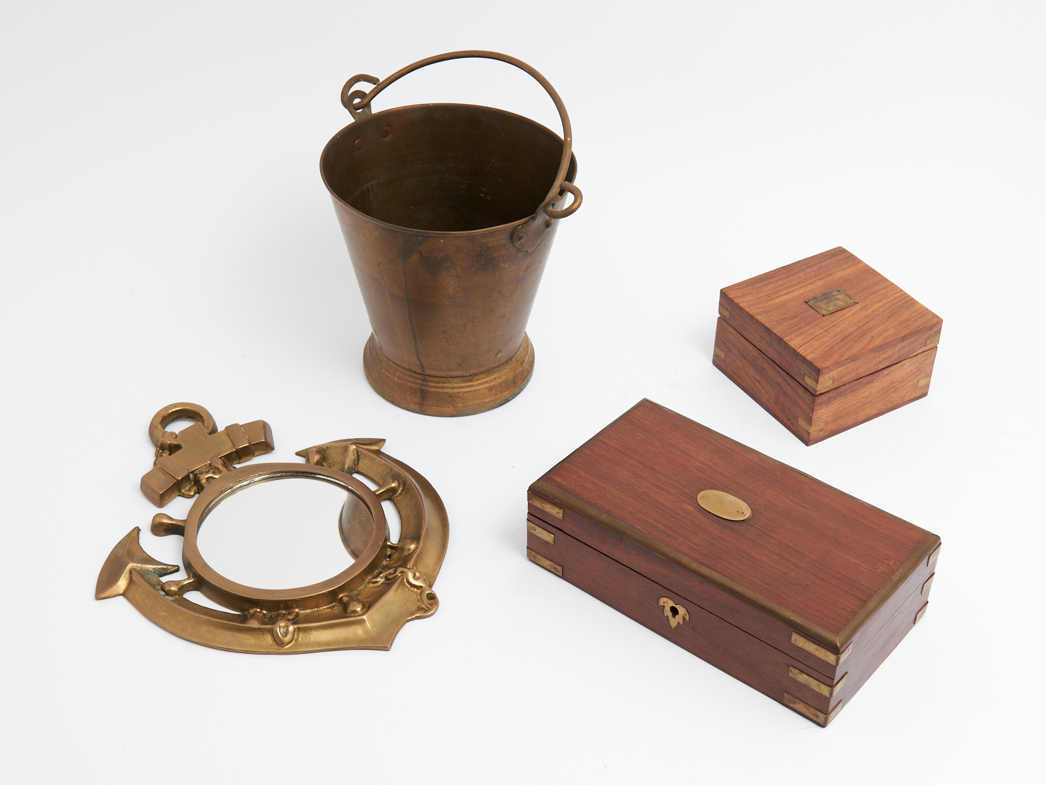 FOUR PIECES OF VINTAGE MARITIME INCLUDING A BOXED SEXTANT, ANCHOR MIRROR, WOODEN AND BRASS BOX, AND BRASS BUCKET H.20CM (LARGEST), LEONARD JOEWL LOCAL DELIVERY: MEDIUM