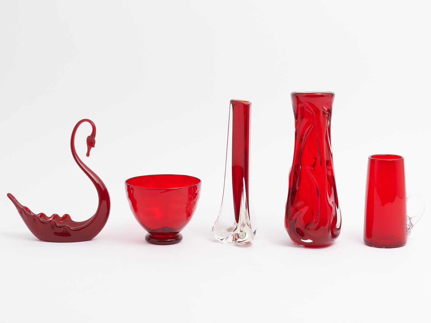 A COLLECTION OF FIVE PIECES OF RED ENGLISH WHITEFRIARS BAXTER GLASS H.25CM (TALLEST), LEONARD JOEL LOCAL DELIVERY: MEDIUM