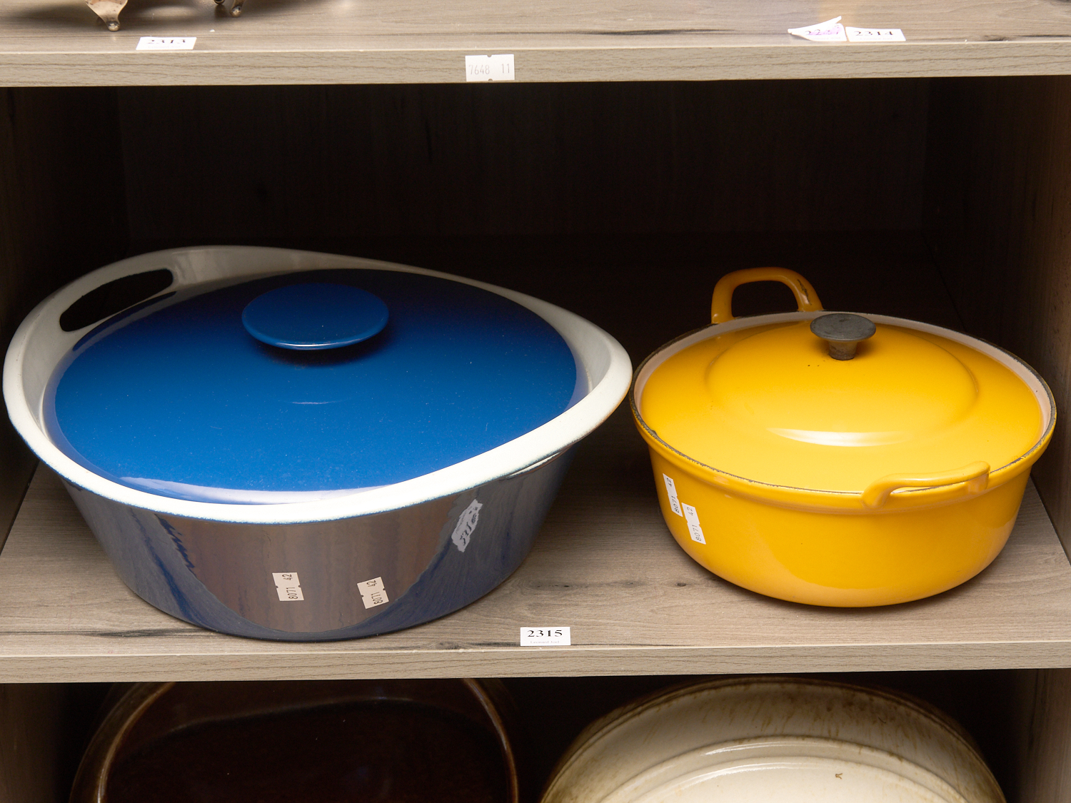 A COPCO CAST-IRON BLUE ENAMEL LIDDED CASSEROLE AND FRENCH COUSANCES ORANGE LIDDED AND HANDLED YELLOW CASSEROLE W.35CM (LARGEST), LEONARD JOEL LOCAL DELIVERY: MEDIUM