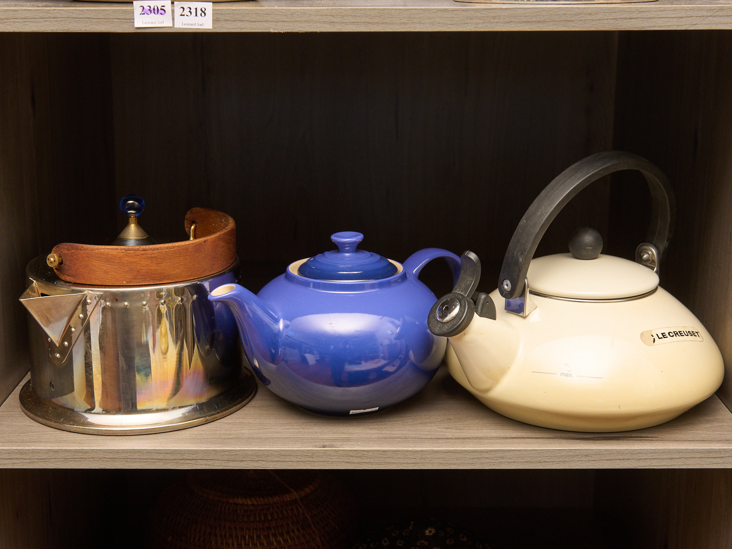A LE CRUESET TEAPOT, KETTLE AND ITALIAN STAINLESS STEEL KETTLE WITH WOODEN HANDLE L.26CM (LONGEST), LEONARD JOEL LOCAL DELIVERY: MEDIUM