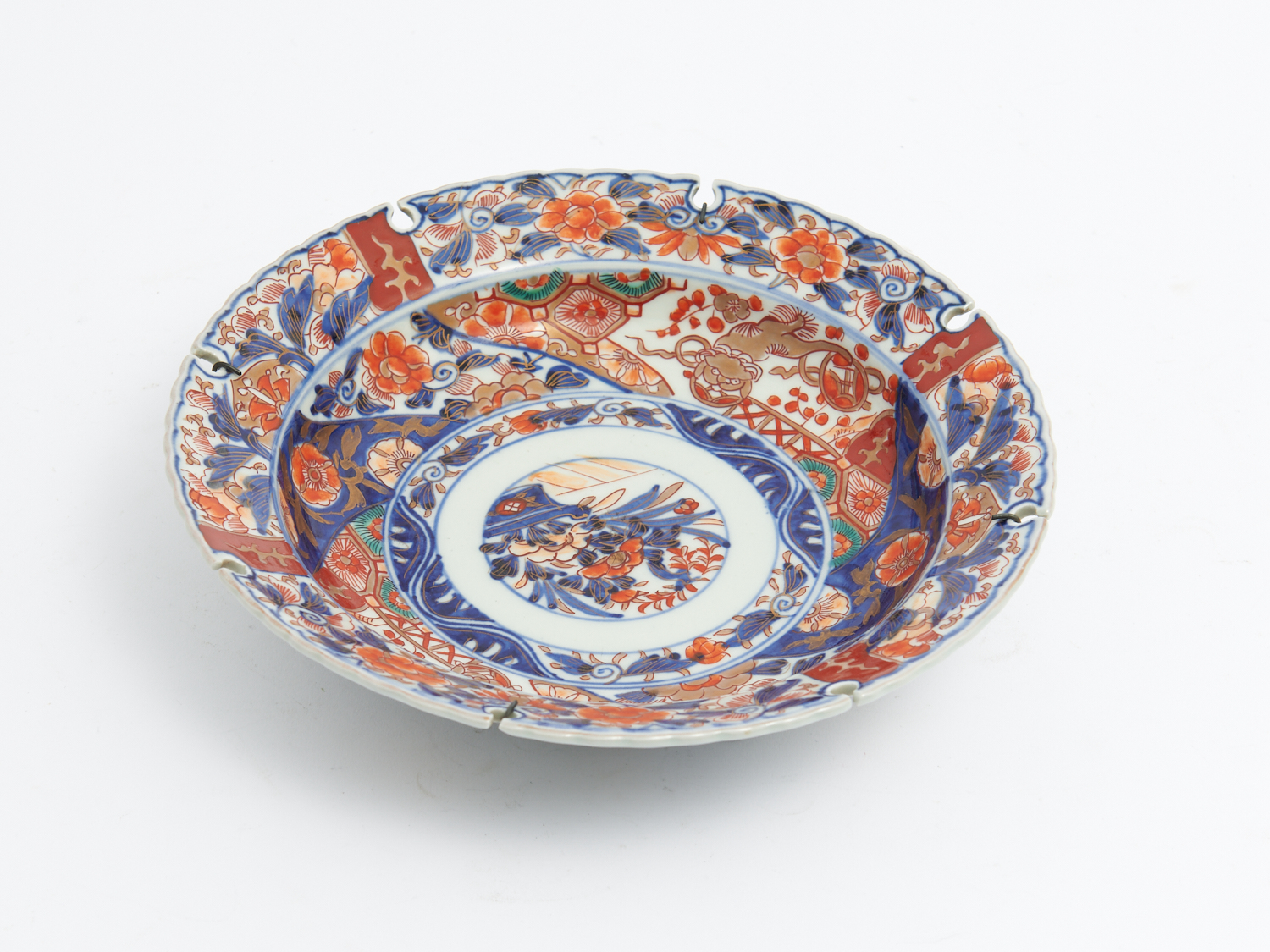 A 19TH CENTURY SIGNED CHINESE BLUE, RED AND GOLD DECORATED CIRCULAR PLATE WITH CUTAWAY DETAILS TO EIGHT POINTS DIA.24.5CM, LEONARD JOEL LOCAL DELIVERY: SMALL