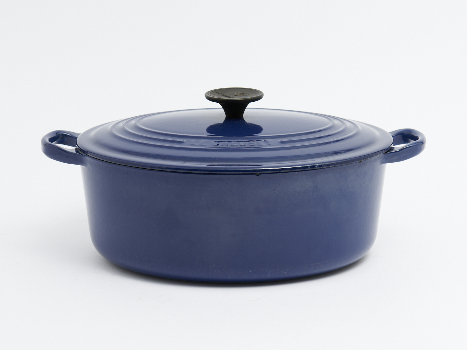 A LARGE DEEP BLUE LIDDED FRENCH LE CREUSET OVAL TWO HANDLED ENAMELLED CAST IRON CASSEROLE L.37CM, LEONARD JOEL LOCAL DELIVERY: MEDIUM