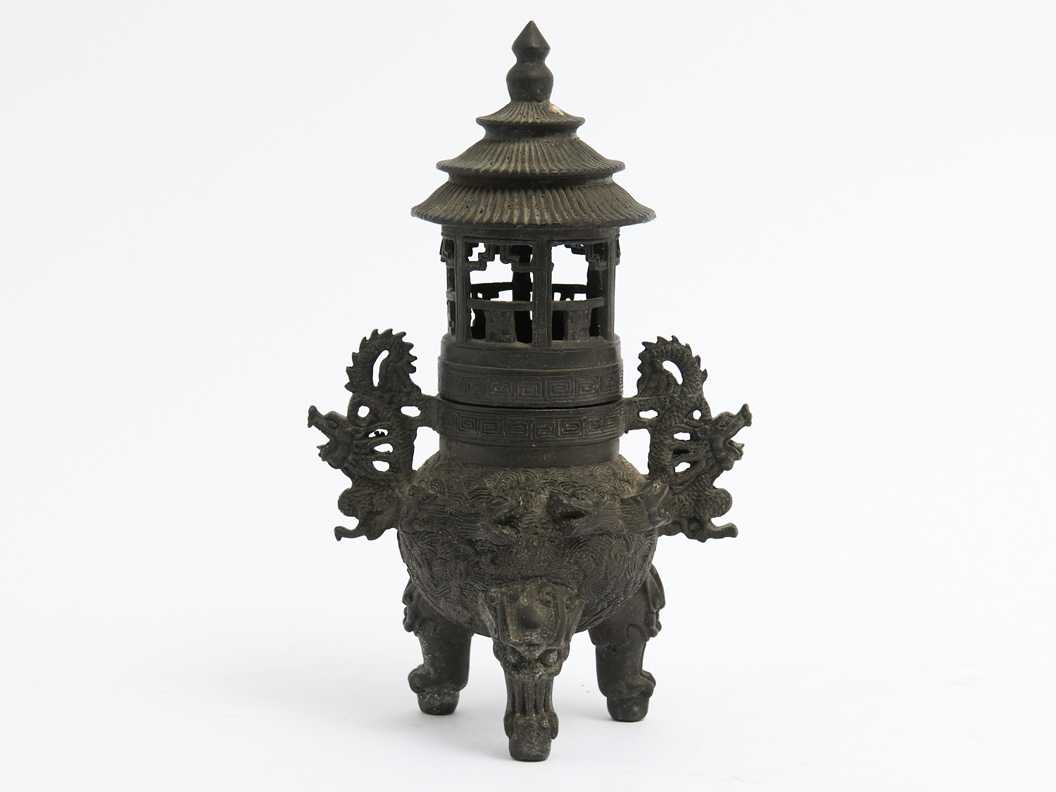 A CHINESE BRONZE DRAGON ADORNED AND HANDLED PIERCED TOP CENSOR, H.21CM, LEONARD JOEL LOCAL DELIVERY: SMALL