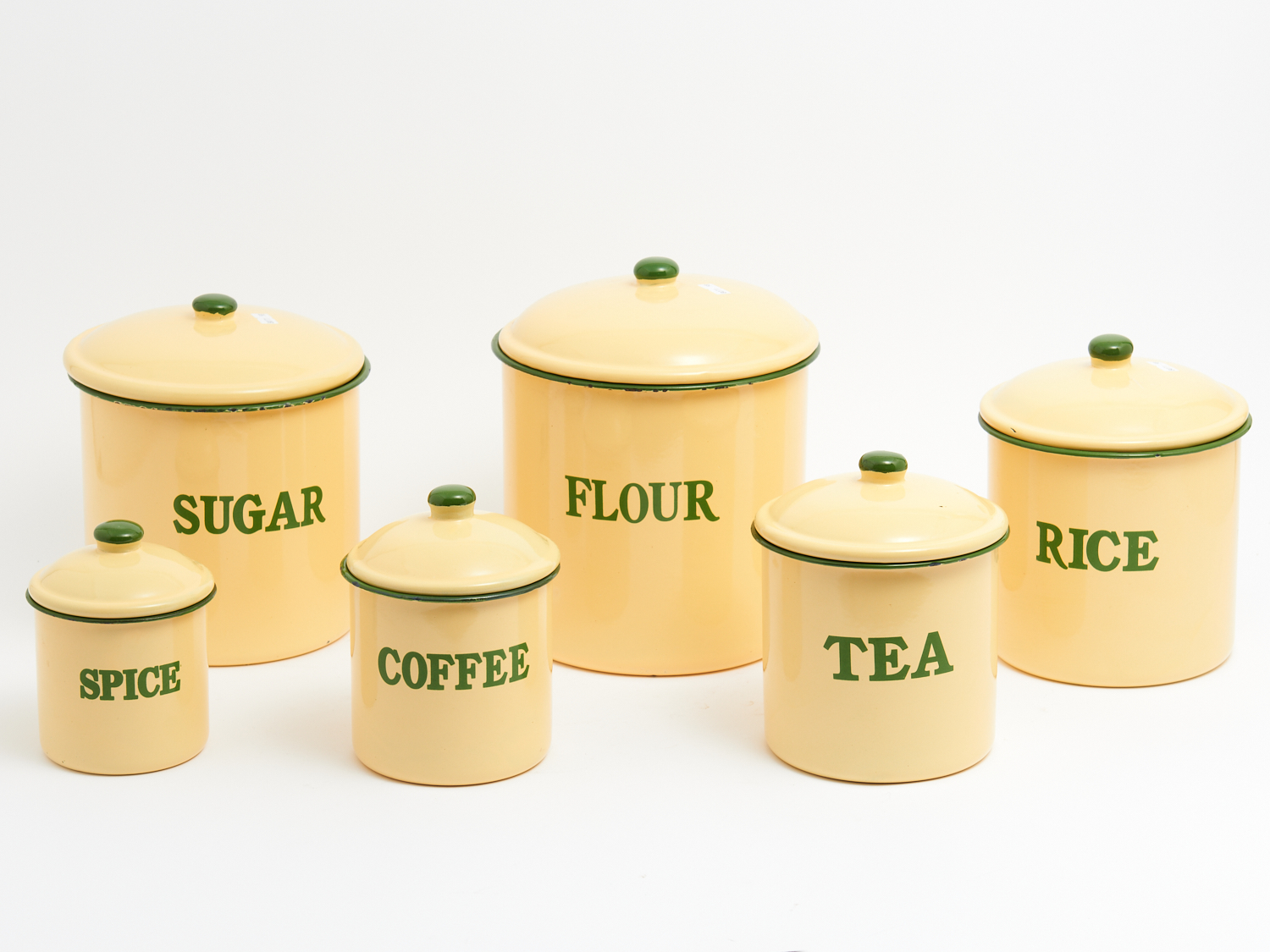 A GRADUATED SET OF SIX VINTAGE AUSTRALIAN ENAMELLED CANISTERS WITH CONTENT NAMES H.26CM (LARGEST), LEONARD JOEL LOCAL DELIVERY: MEDIUM