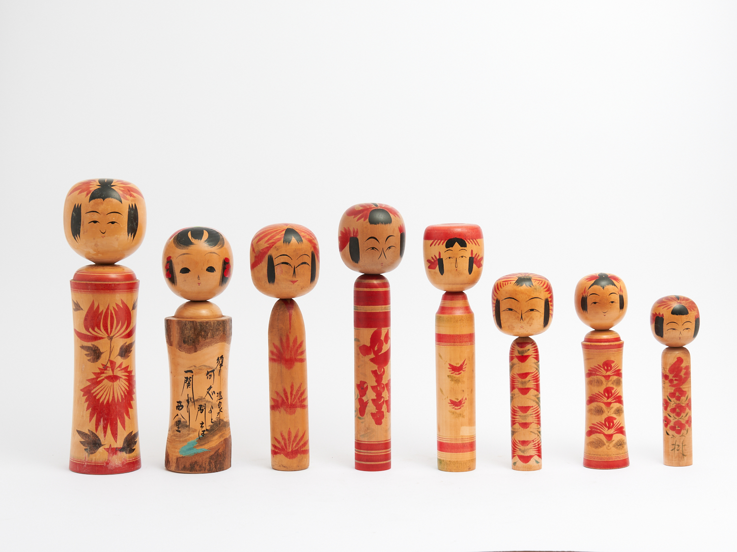 A COLLECTION OF EIGHT HAND PAINTED WOODEN KOKESHI DOLLS H.31CM (TALLEST) LEONARD JOEL DELIVERY SIZE: MEDIUM