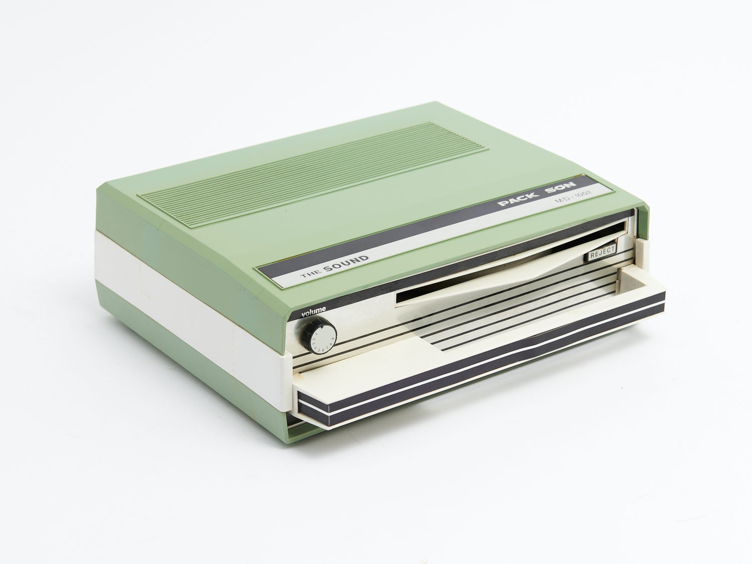 A 1960S ENGLISH GREEN PACK SON THE SOUND PORTABLE RECORD PLAYER W.27CM, LEONARD JOEL LOCAL DELIVERY: SMALL