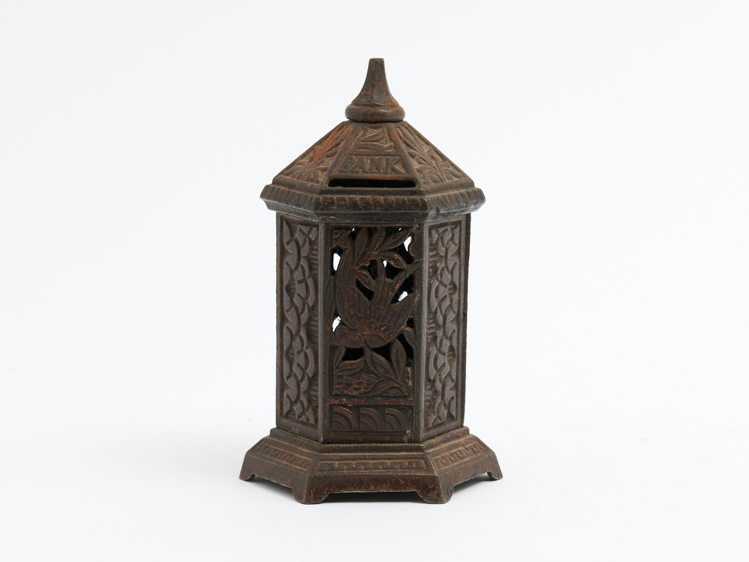 A 19TH CENTURY ENGLISH CAST IRON HEXAGONAL FORM MONEY BANK WITH PIERCED CUTAWAY BIRD DECORATION AND REGISTRATION NUMBER TO BASE H.16CM, LEONARD JOEL LOCAL DELIVERY: SMALL