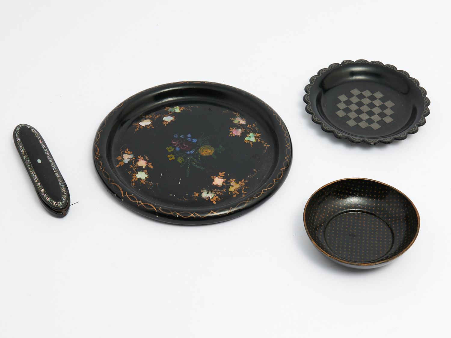 A COLLECTION OF THREE 19TH CENTURY ENGLISH AND FRENCH PAPIER-MÂCHÉ AND MOTHER-OF-PEARL INLAID LACQUER TRAYS, AND A CASE WITH STEEL FRAMED GLASSES DIA.24.5CM (LARGEST), LEONARD JOEL LOCAL DELIVERY: SMALL