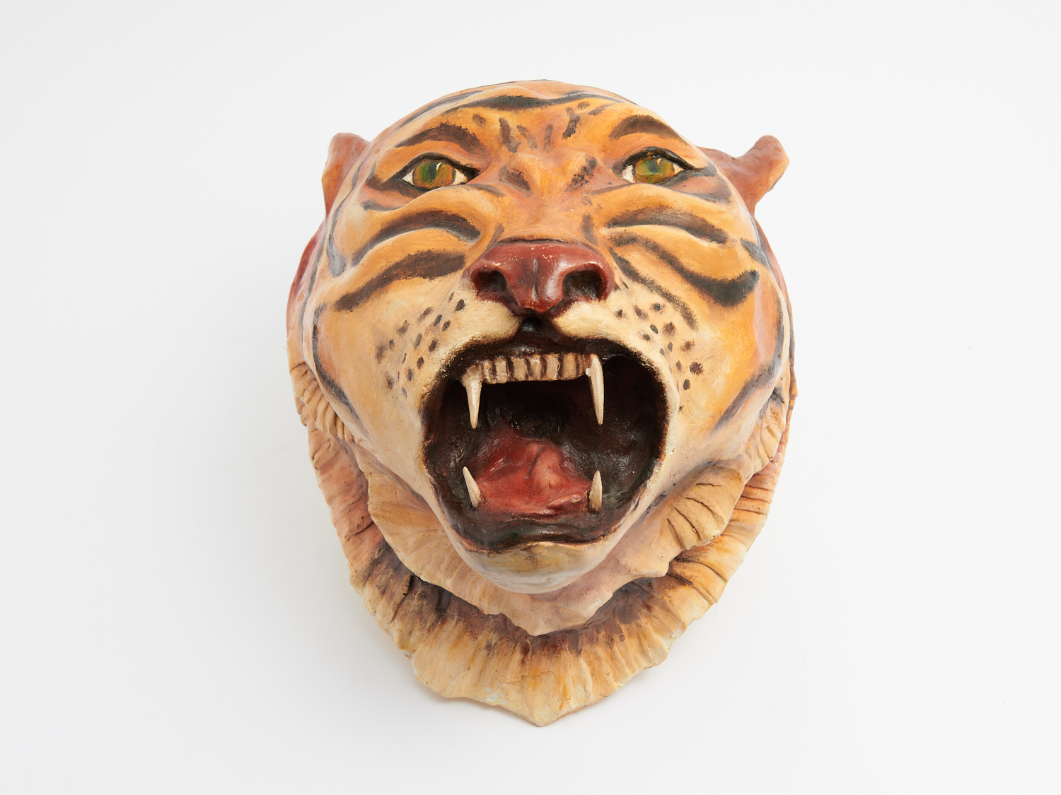 A HAND PAINTED HARD PLASTER WALL MOUNTED TIGER HEAD, H.40CM, LEONARD JOEL LOCAL DELIVERY: MEDIUM