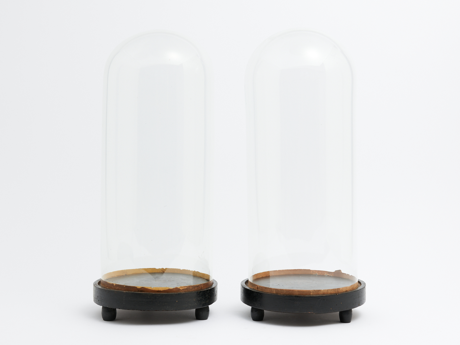 A PAIR OF 19TH CENTURY FRENCH EBONISED WOODEN BASED GLASS DISPLAY DOMES H.44CM, LEONARD JOEL LOCAL DELIVERY: MEDIUM