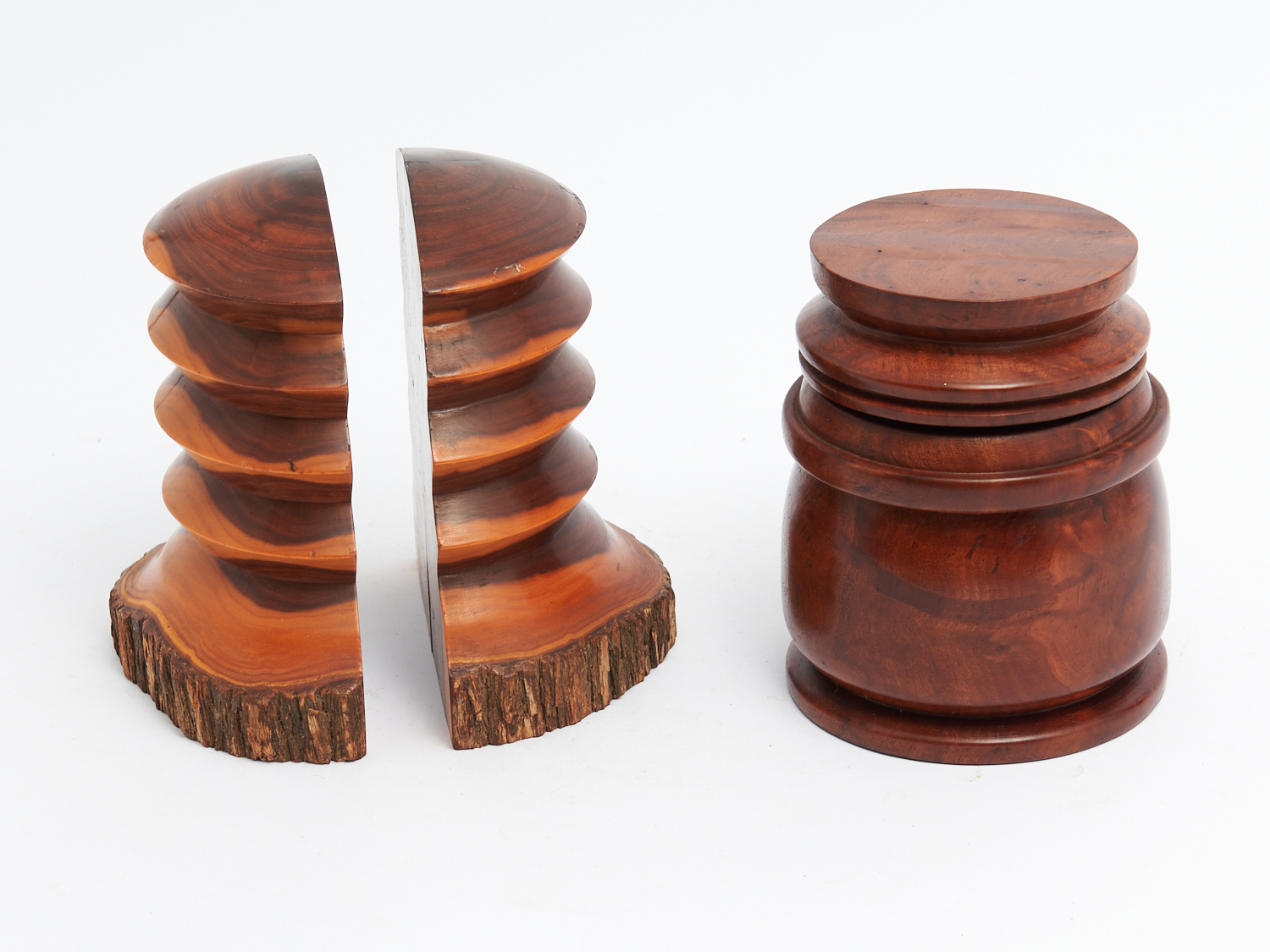 A 1940'S TURNED WOOD PAIR OF BOOKENDS AND A TURNED WOOD LIDDED JAR H.17CM (TALLEST), LEONARD JOEL DELIVERY SIZE: MEDIUM