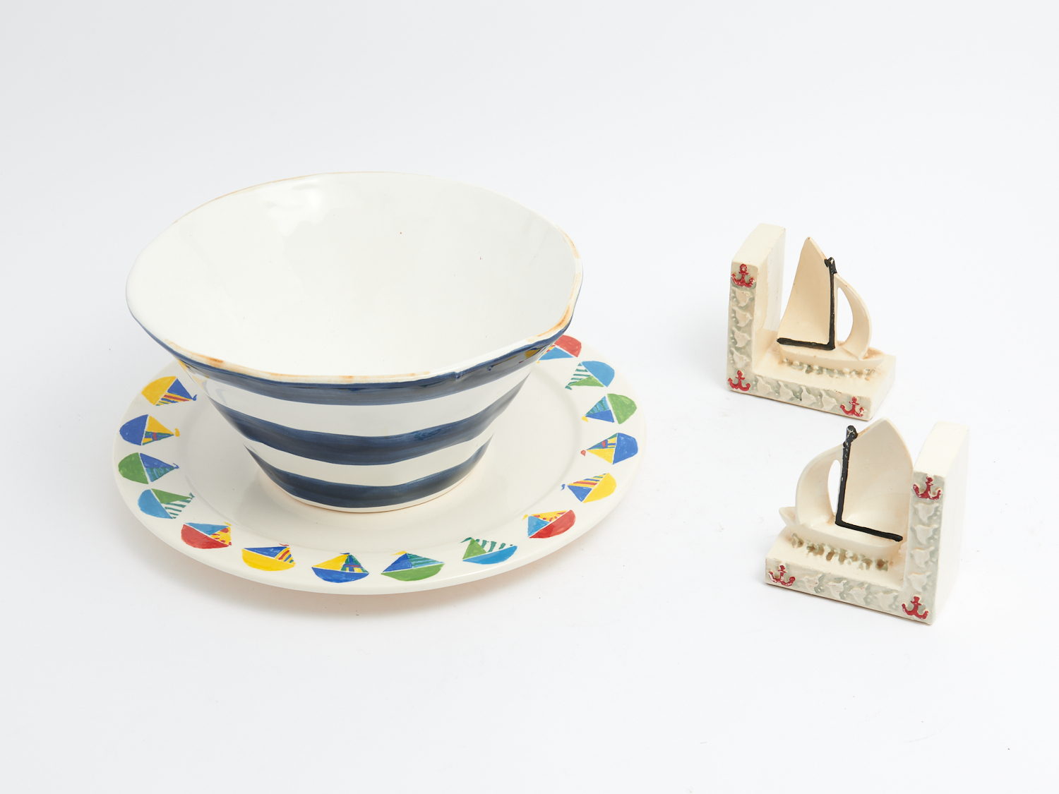 A COLLECTION OF BOATING THEMED CERAMICS INCL. A BOWL, CHARGER AND BOAT FORM BOOKENDS DIA.38CM (CHARGER), LEONARD JOEL DELIVERY SIZE: LARGE