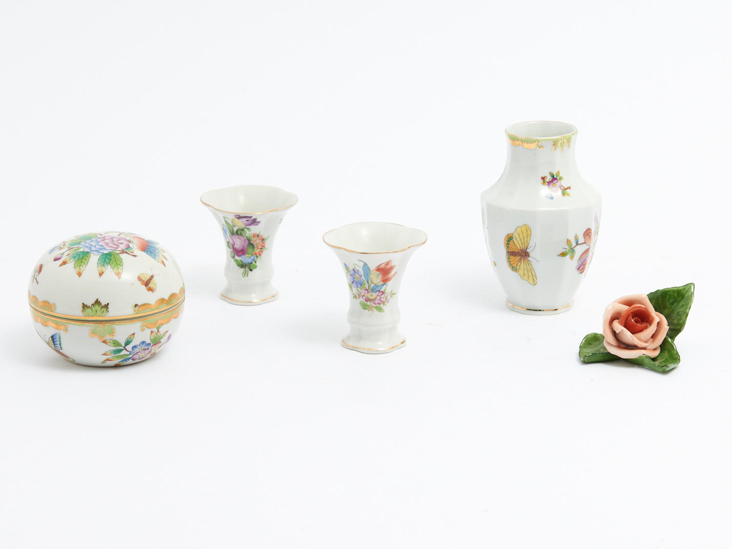 A COLLECTION OF HEREND PORCELAIN INCL. THREE VASES, A LIDDED JAR AND A ROSE H.12CM (TALLEST), LEONARD JOEL DELIVERY SIZE: MEDIUM