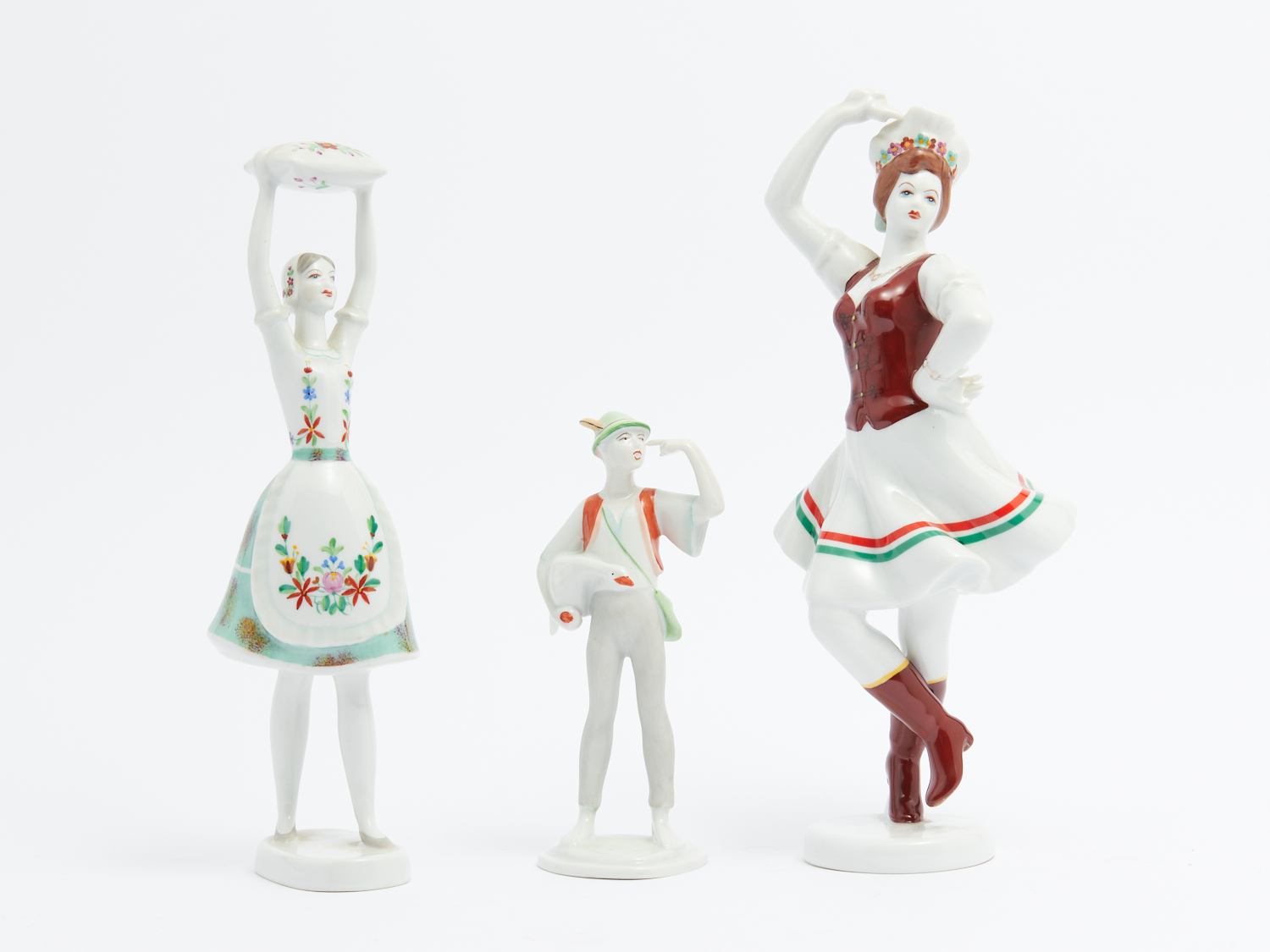THREE HOLLOHAZA PORCELAIN FIGURES IN FOLK HUNGARIAN DRESS H.31CM (TALLEST), LEONARD JOEL DELIVERY SIZE: LARGE