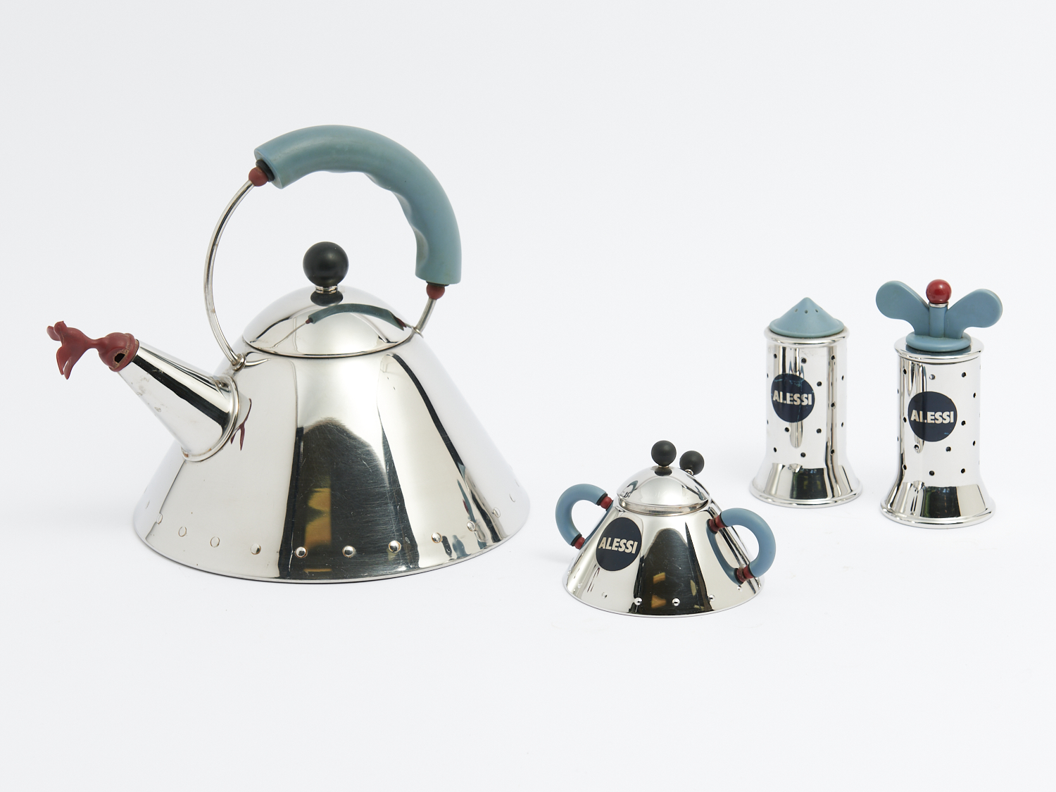A SET OF ALESSI ITEMS BY MICHAEL GRAVES INCL. KETTLE, SUGAR WITH SPOON, SALT AND PEPPER H.23CM (TALLEST), LEONARD JOEL DELIVERY SIZE: MEDIUM