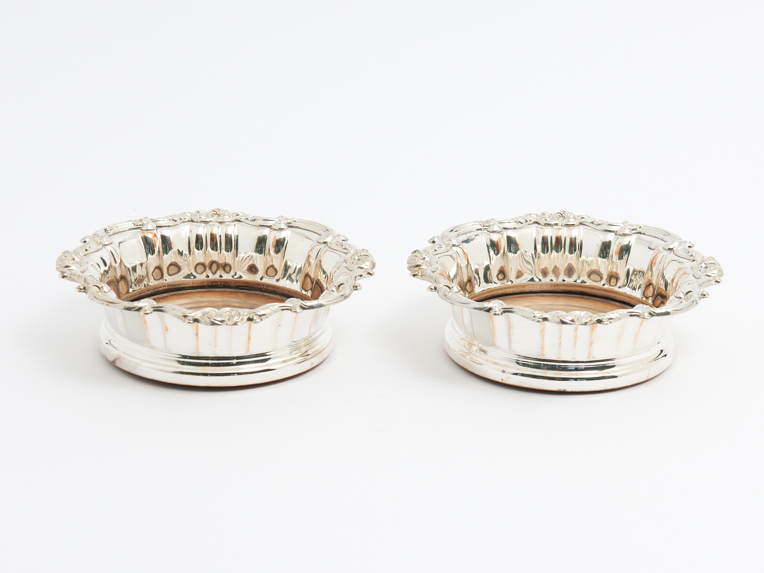 A FINE PAIR OF EARLY 19TH CENTURY ENGLISH SHEFFIELD SILVER PLATE BOTTLE COASTERS WITH WOODEN BASES AND SILVER CENTRAL MEDALLION DIA.18CM, LEONARD JOEL DELIVERY SIZE: SMALL