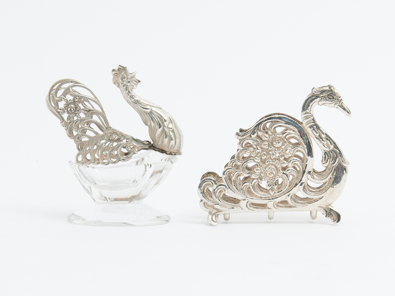 A GERMAN 835 SILVER COCKERELL OPEN SALT AND A SWAN FORM LETTER HOLDER H.9CM (TALLEST), LEONARD JOEL DELIVERY SIZE: SMALL