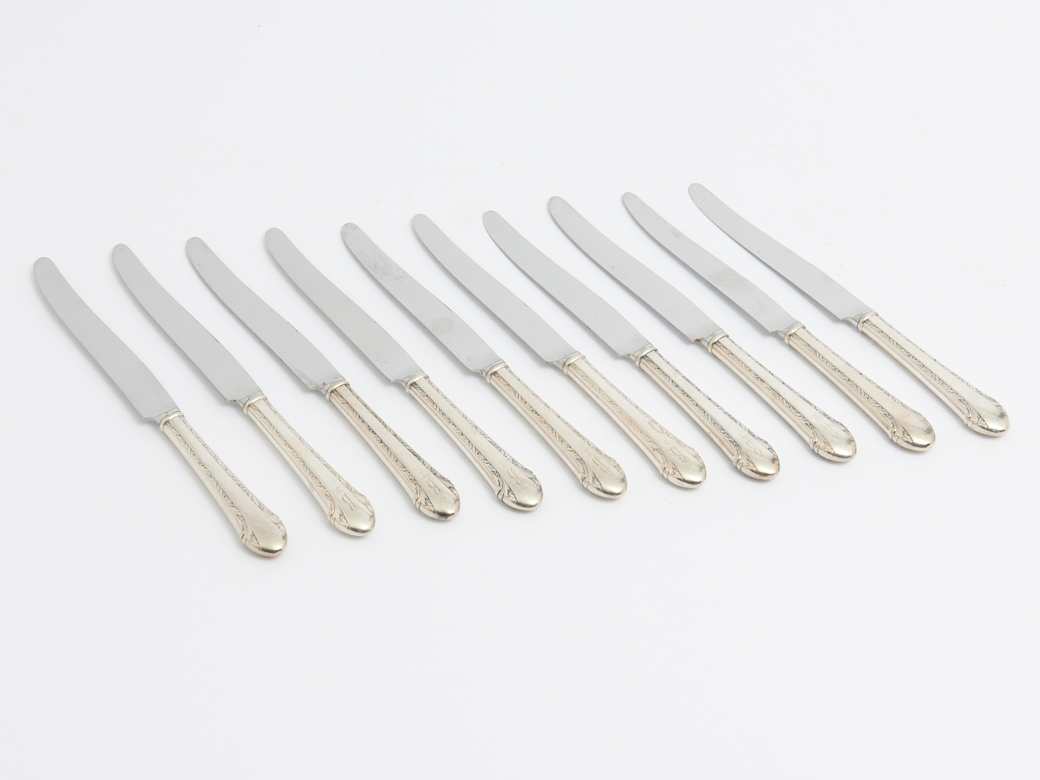 A SET OF TEN EARLY 20TH CENTURY GERMAN 835 SILVER HANDLED DINNER KNIVES L.22.5CM, LEONARD JOEL DELIVERY SIZE: SMALL