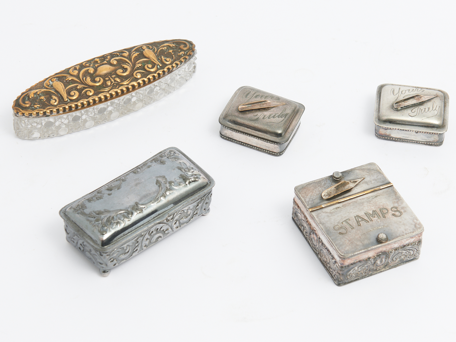 A GROUP OF FIVE 19TH CENTURY SILVER PLATE BOXES INCLUDING THREE QUILL BOXES, A STAMP BOX AND A DRESSING TABLE BOX L.13.5CM (LARGEST), LEONARD JOEL DELIVERY SIZE: SMALL