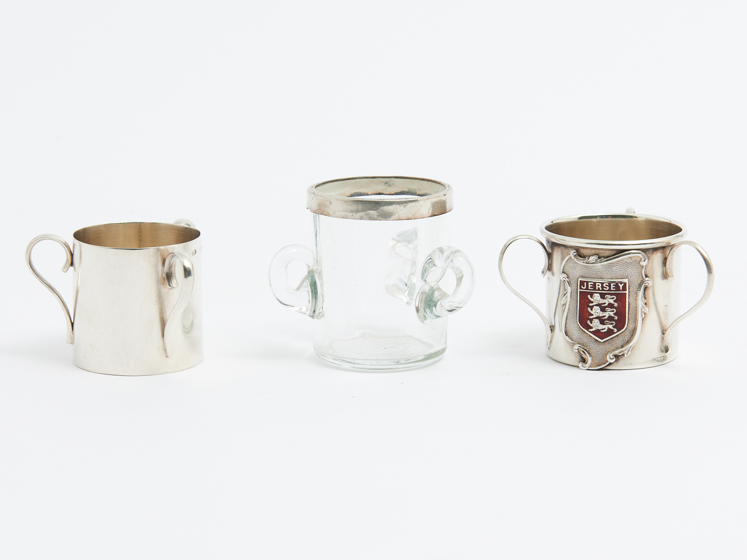 A GROUP OF THREE HALLMARKED ENGLISH STERLING SILVER THREE HANDLED MINIATURE TYGS H.5.5CM (TALLEST), LEONARD JOEL DELIVERY SIZE: SMALL