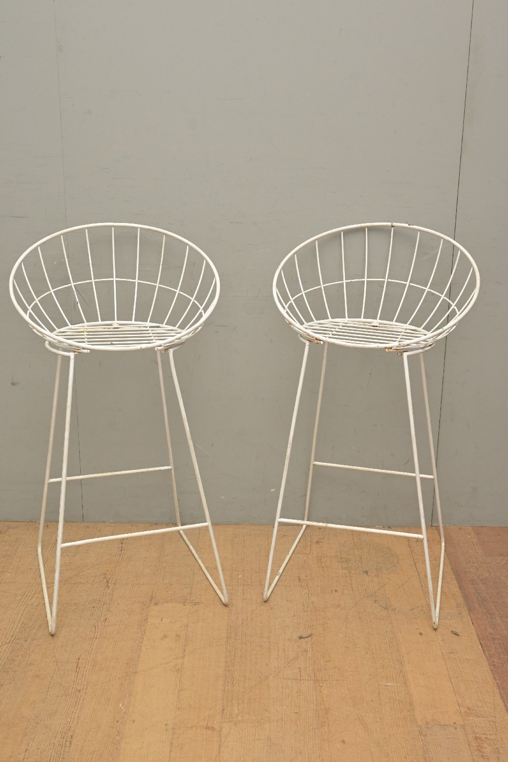 TWO WHITE METAL BARSTOOLS (A/F) (98H X 54W X 52D CM) (LEONARD JOEL DELIVERY SIZE: LARGE)