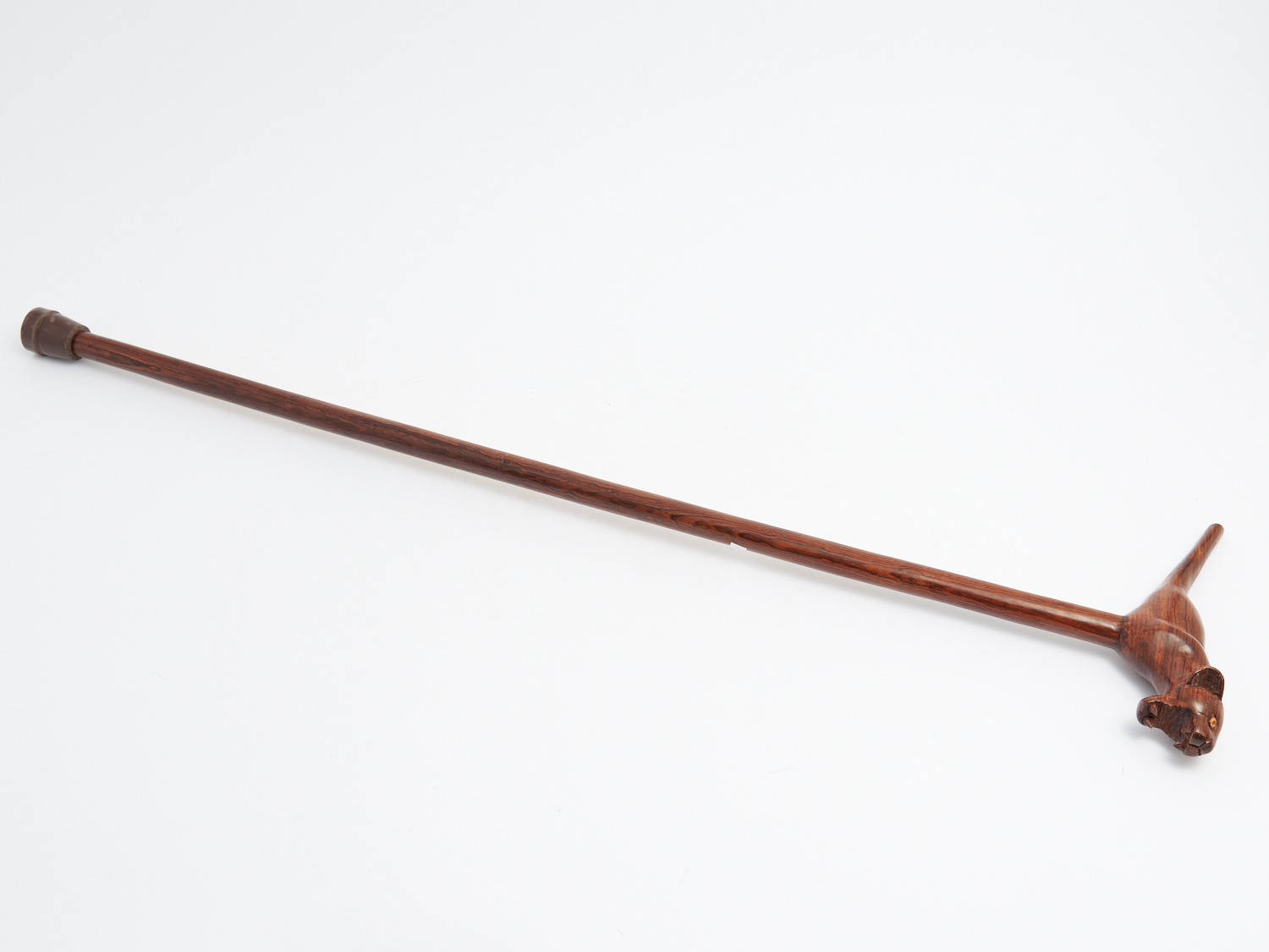 AN EXOTIC WOOD WALKING STICK WITH CARVED TIGER HANDLE (A/F) L.96CM, LEONARD JOEL DELIVERY SIZE: SMALL