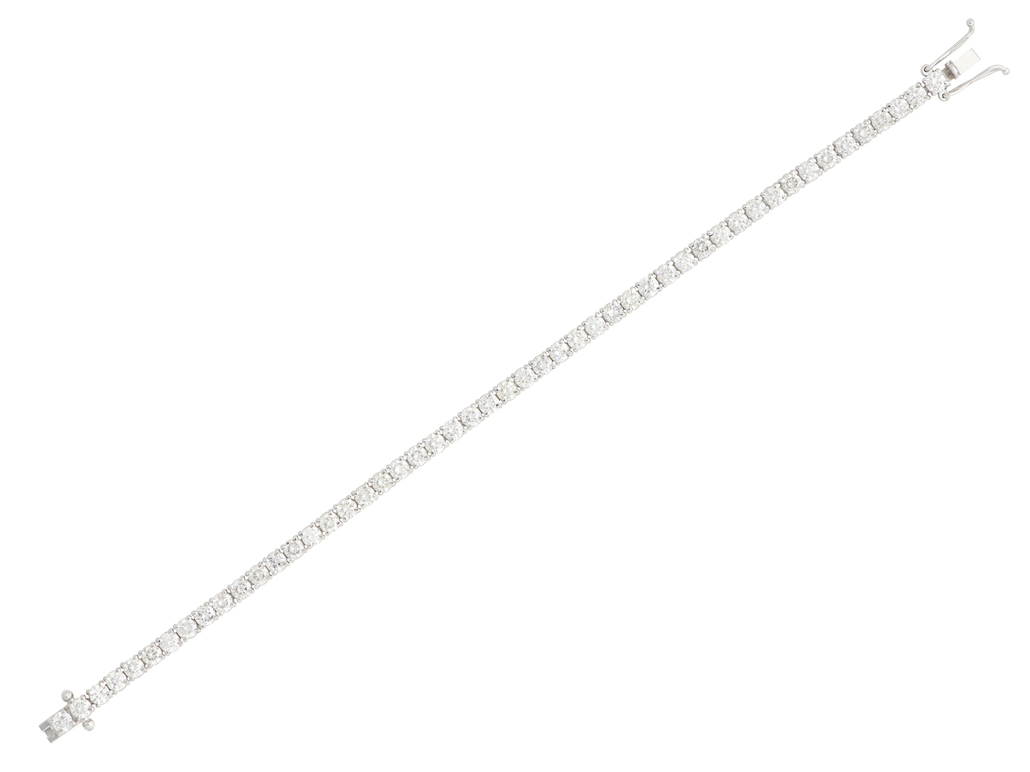 Designed as a continuous line of claw-set brilliant-cut diamonds together weighing approximately 8.08 carats, completed by a concealed box clasp, mounted in 18ct white gold, length 185mm, gross weight approximately 9.5 grams.