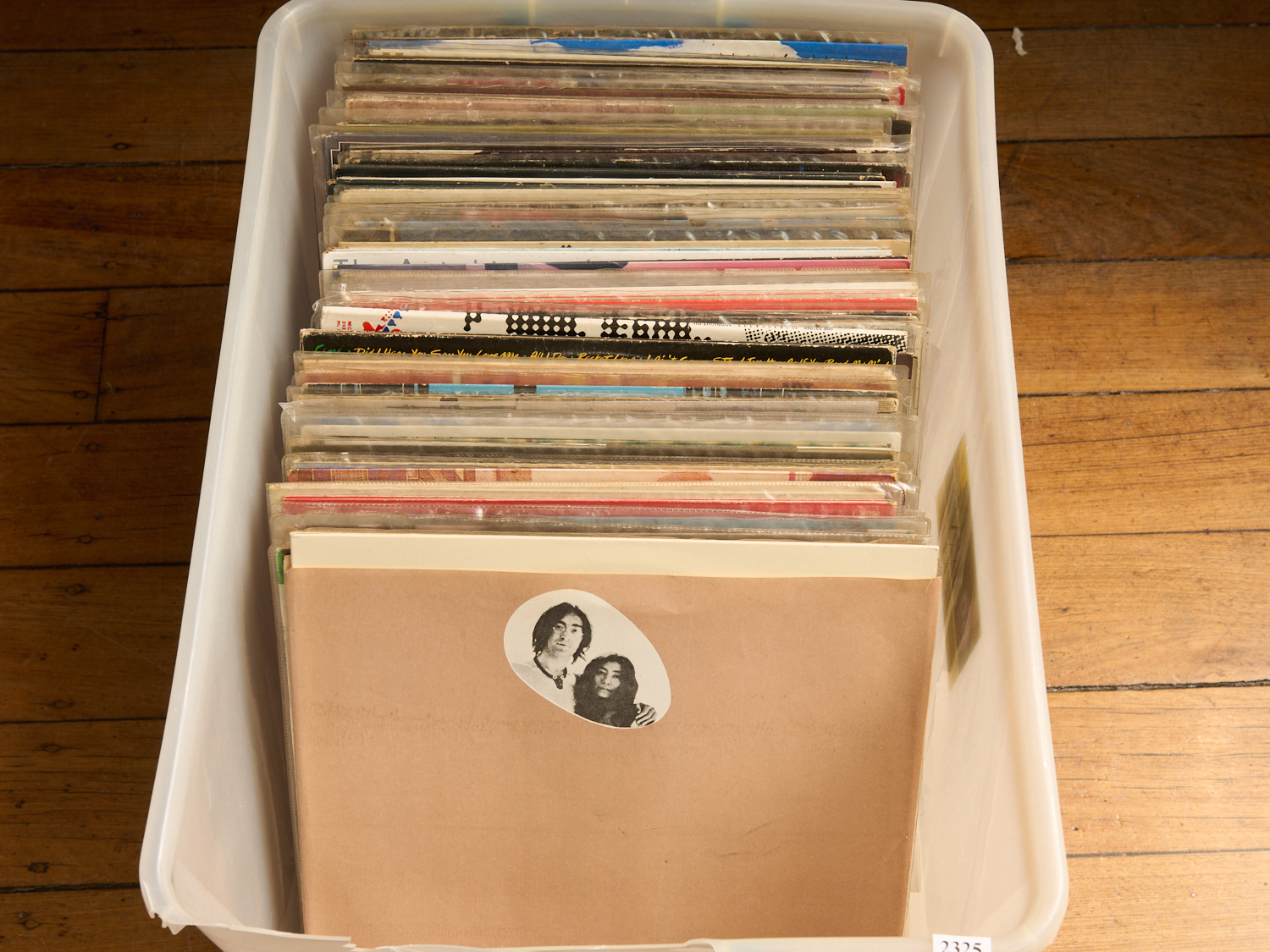 A BOX OF RECORDS INCLUDING JOHN LENNON AND YOKO ONO, LED ZEPPLIN, ERIC CLAPTON, JIMI HENDRIX, LOU REED, THE DOORS, QUEEN, NEIL YOUNG, COLD CHISEL, MIDNIGHT OIL, CAT STEVENS, THE BEACH BOYS, DIRE STRAITS, THE BEATLES, TALKING HEADS, GENESIS, AND SPLIT ENZ