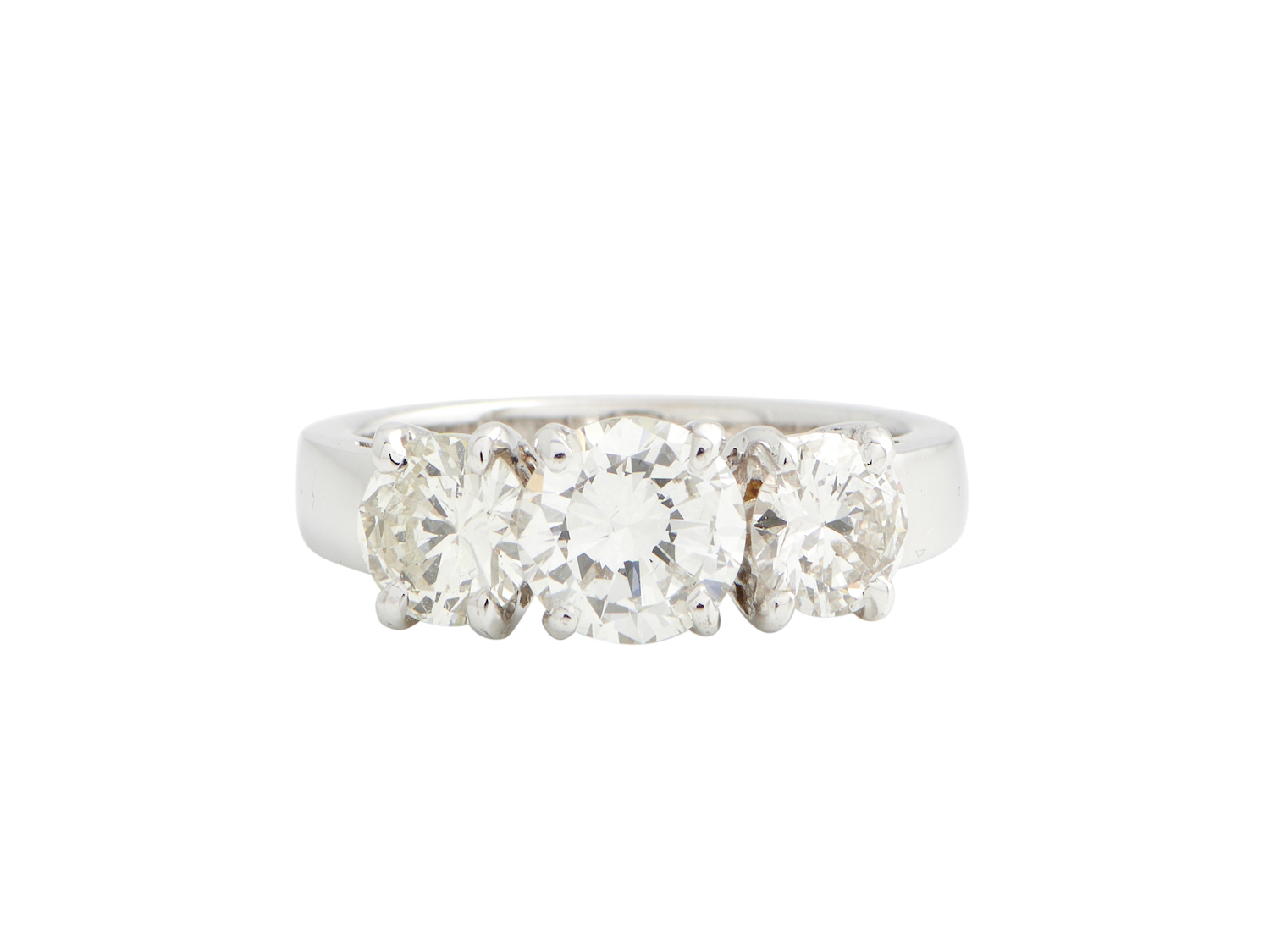 Centring a claw-set brilliant-cut diamond weighing approximately 1.36 carats, flanked by a similarly set brilliant-cut diamond, the diamonds together weighing approximately 1.52 carats, mounted in 18ct white gold, size O1/2, gross weight approximately 6.3 grams.