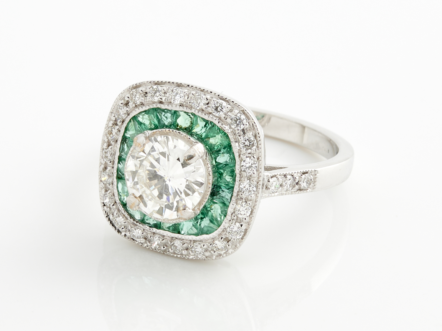 Centring a claw-set brilliant-cut diamond weighing approximately 1.01 carats, within a surround of calibre-cut emeralds and a further surround of brilliant-cut diamonds, the emeralds and diamonds weighing approximately 0.80 carats and 0.28 carats respectively, mounted in 18ct white gold, size M, gross weight approximately 4.5 grams.