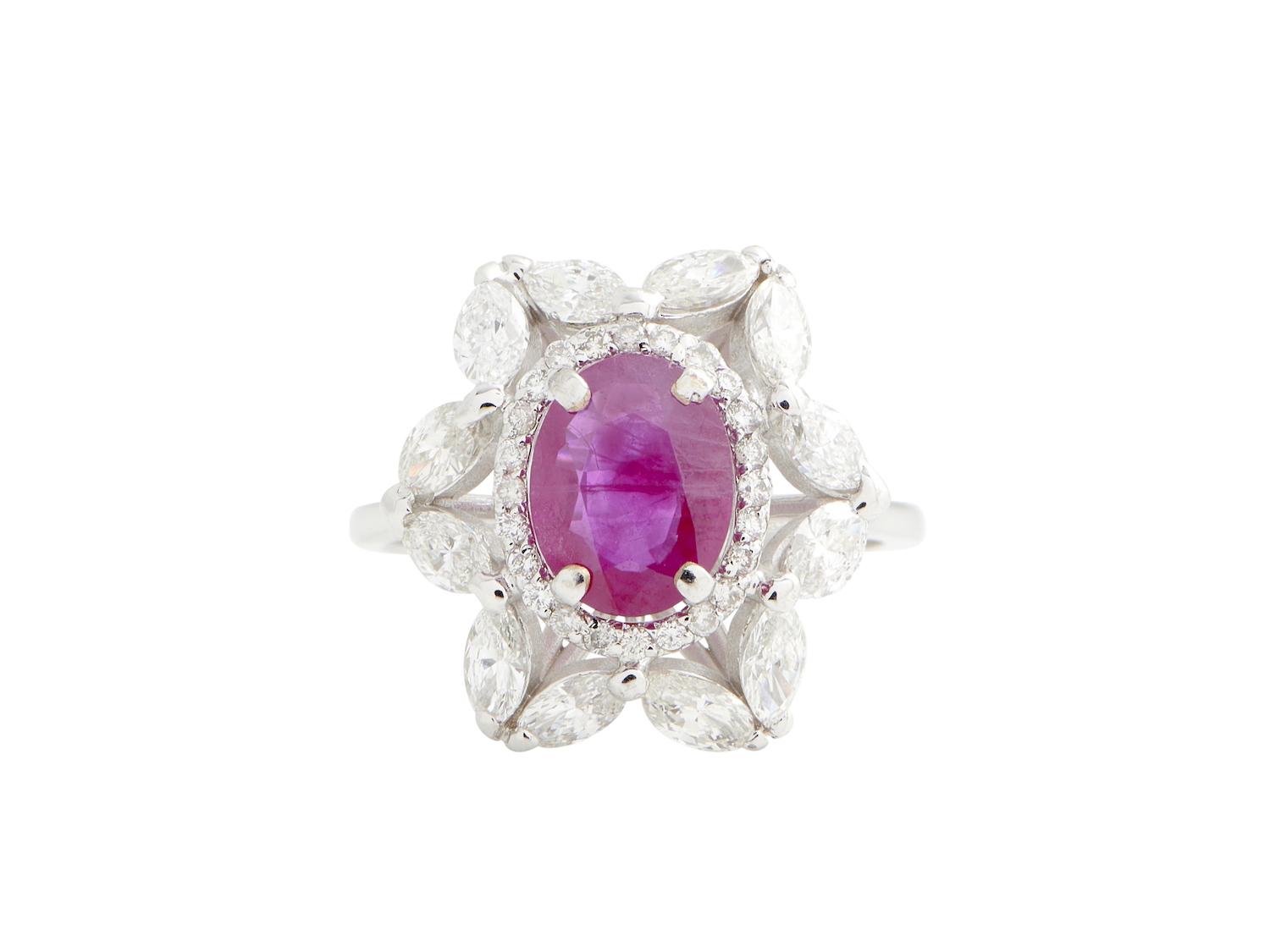 Of cluster design, centring a claw-set oval-cut ruby weighing 1.60 carats, within a surround of brilliant-cut diamonds and a further surround of marquise-cut diamonds, the diamonds together weighing approximately 1.47 carats, mounted in 18ct white gold, size N, gross weight approximately 4.8 grams.