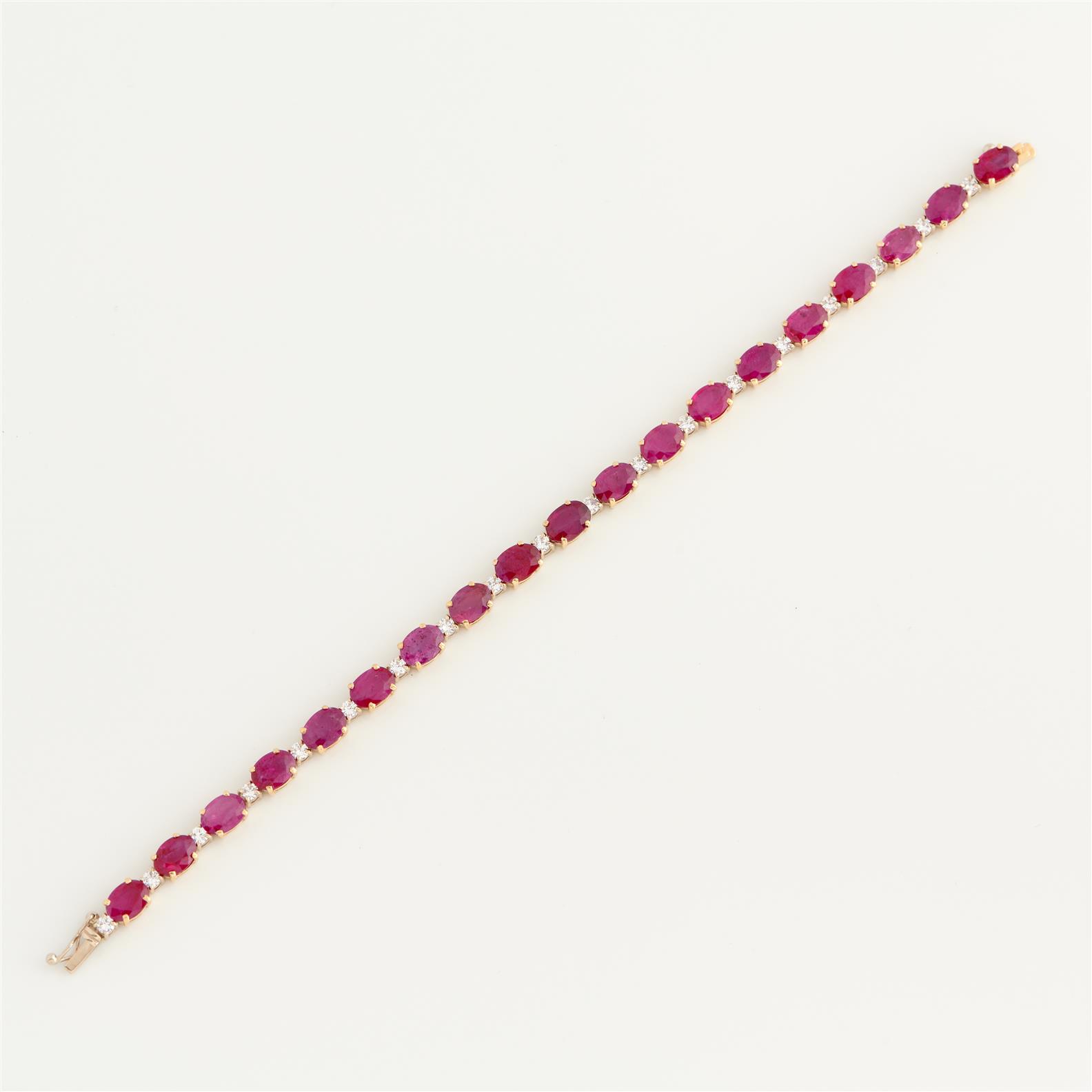 A RUBY AND DIAMOND BRACELET IN 18CT TWO-TONE GOLD, MODELLED AS A LINE OF CLAW-SET OVAL-CUT RUBIES, SPACED BY CLAW-SET BRILLIANT-CUT DIAMONDS, THE RUBIES TOGETHER WEIGHING APPROXIMATELY 18.15 CARATS, THE DIAMONDS TOGETHER WEIGHING APPROXIMATELY 1.04 CARATS, COMPLETED BY A TONGUE AND GROOVE CLASP, LENGTH 180MM