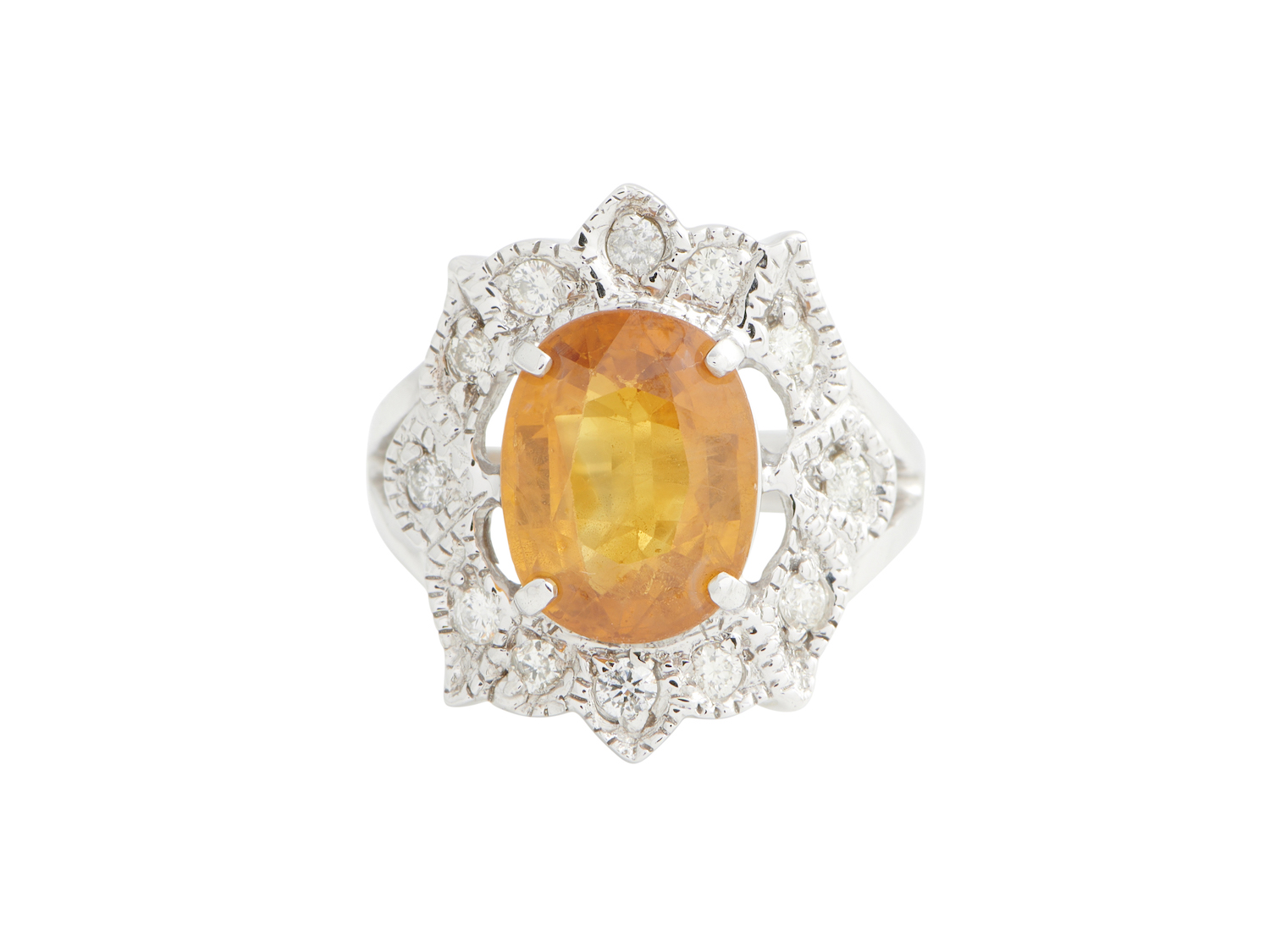 Of cluster design, claw-set with an oval-cut yellow sapphire weighing approximately 5.35 carats, within a decorative diamond surround, the diamonds together weighing approximately 0.35 carats, mounted in 18ct white gold, size N, gross weight approximately 9 grams.