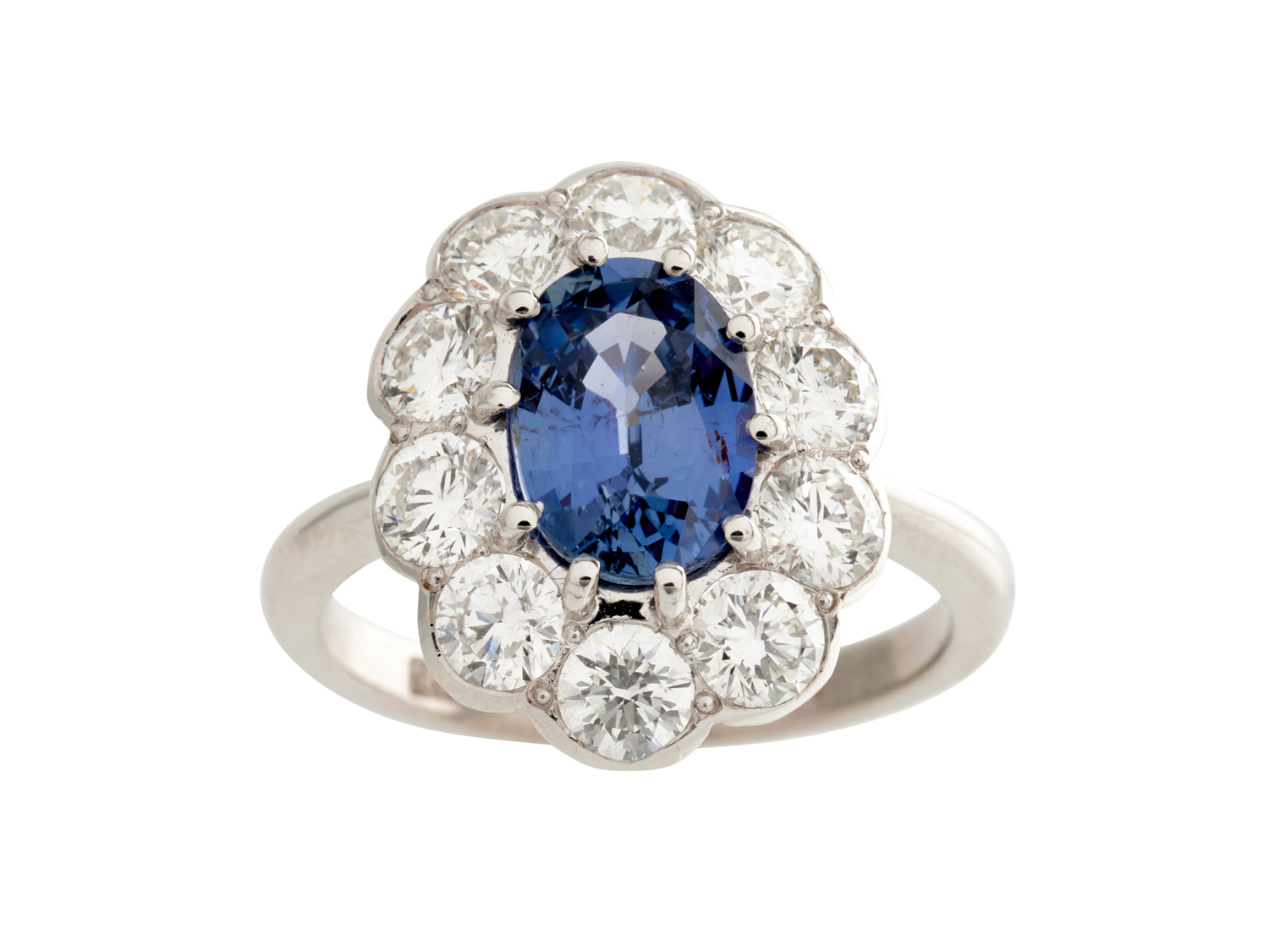 Of cluster design, centring a claw-set oval-cut sapphire weighing approximately 2.36 carats, within a surround of brilliant-cut diamonds together weighing approximately 2.00 carats, size O.