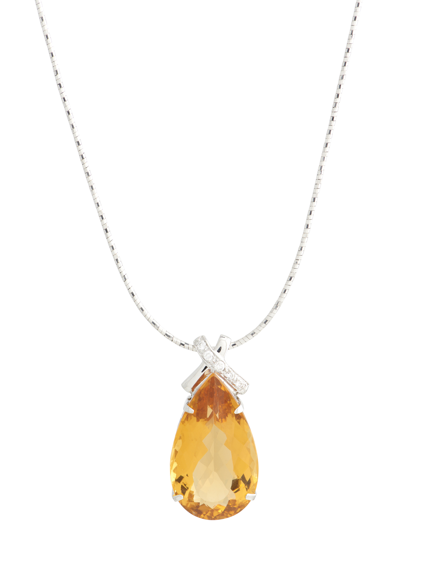 Centring a claw-set pear-shaped heliodor weighing approximately 51.55 carats, accented above with a 'X' motif pavé-set with brilliant-cut diamonds, the diamonds together weighing approximately 0.40 carats, supported from faceted omega chain, mounted in 18ct white gold, pendant length 43mm, chain length 450mm, gross weight approximately 27 grams.