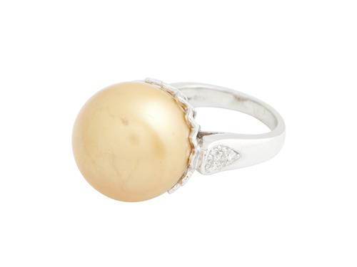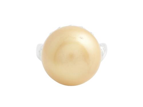 In our opinion, the pearl is of golden bodycolour with a variation green overtones. Naturally occurring pitting, indents, and growth structures to the nacre. Good lustre, some scratches to the surface. The diamonds are bright and lively, probably of H to I colour and SI clarity, as gauged and graded within the limitations of the cutting style and the mounting.