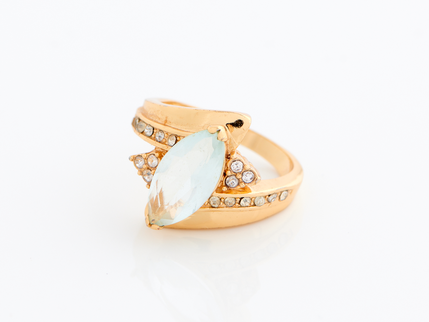 AN AQUAMARINE AND WHITE STONE RING IN GOLD PLATE, SIZE N, BOXED