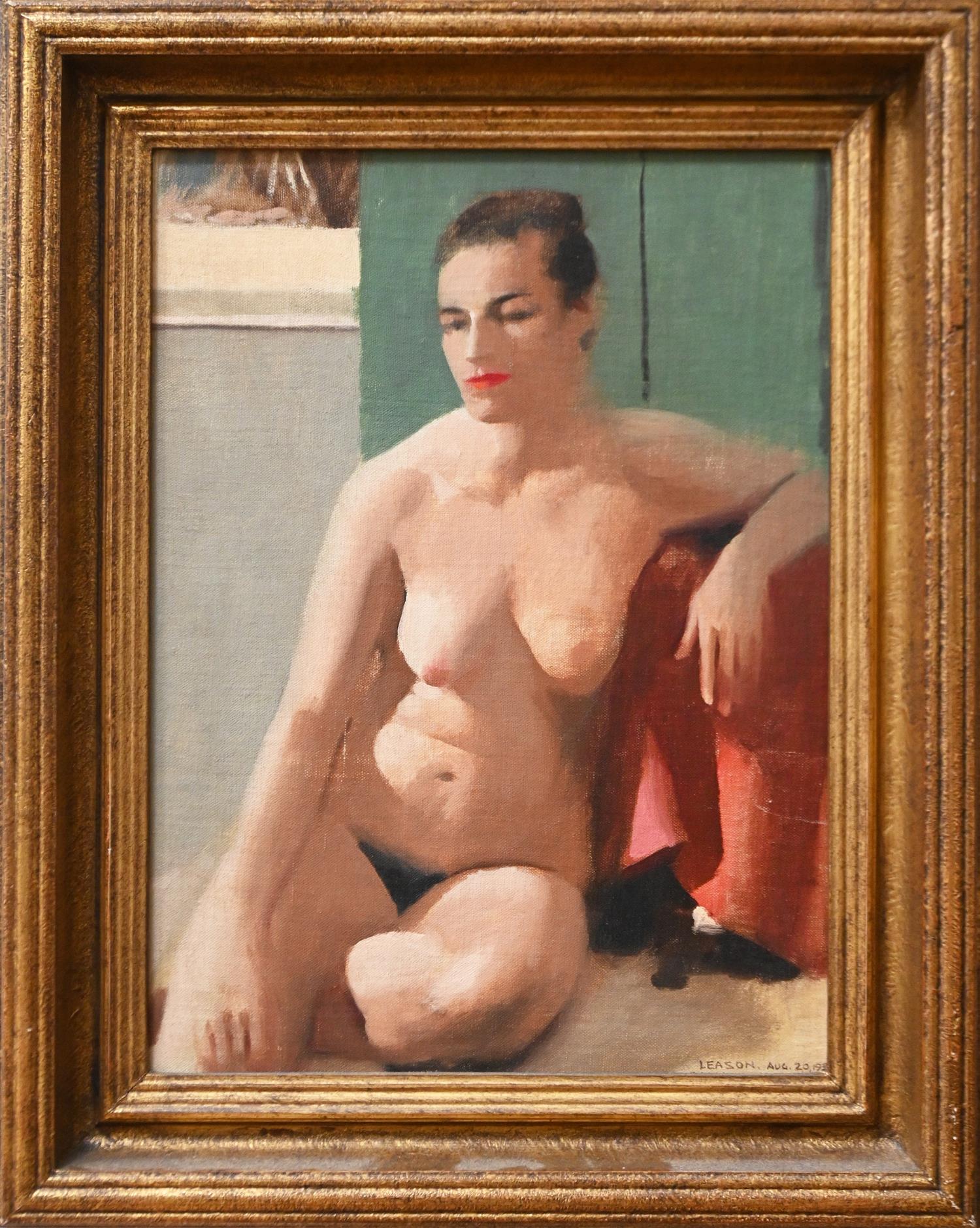 § PERCY LEASON, NUDE STUDY 1956, OIL ON CANVASBOARD, SIGNED AND DATED LOWER RIGHT, 39 X 29CM, FRAME SIZE: 52 X 42CM