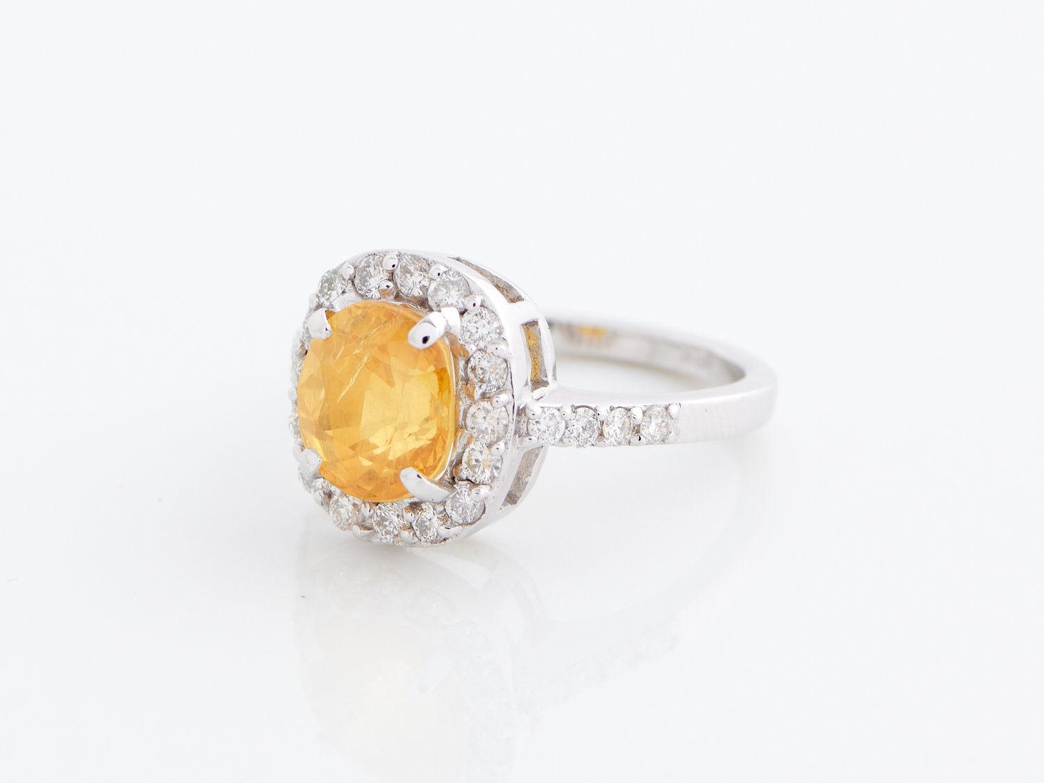A YELLOW SAPPHIRE AND DIAMOND RING IN 18CT WHITE GOLD, THE SAPPHIRE WEIGHING 3.62CTS, THE DIAMONDS TOTALLING 0.78CTS, SIZE M