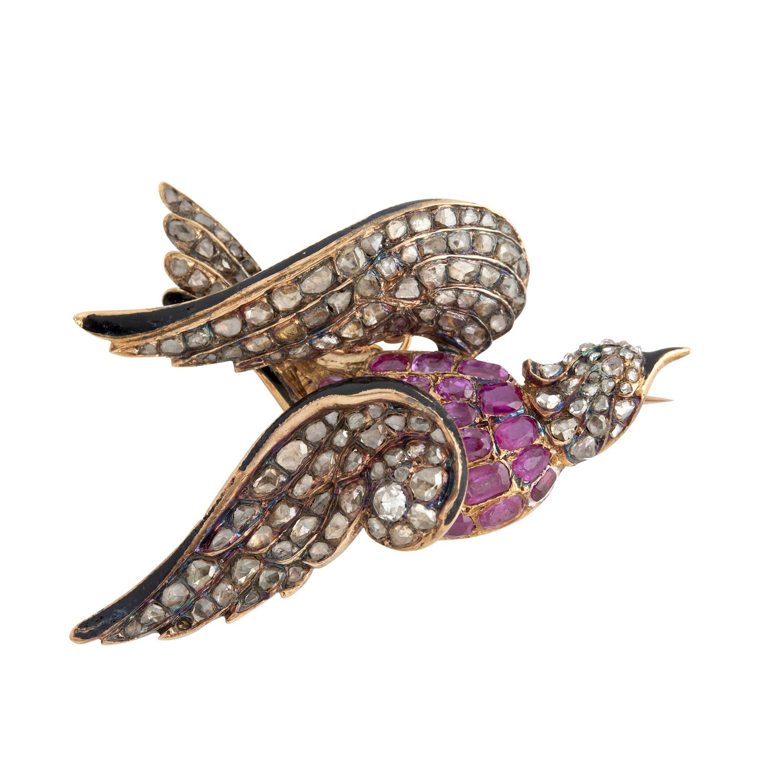 AN ENAMEL, RUBY AND DIAMOND BROOCH IN 18CT GOLD, MODELLED AS A BIRD WITH AN ARTICULATED WING, THE BODY DETAILED WITH OVAL-CUT RUBIES, THE HEAD AND WINGS DETAILED WITH ROSE-CUT DIAMONDS AND BLACK ENAMEL ACCENTS, LENGTH 25MM, WIDTH 46MM, GROSS WEIGHT 17.3 GMS