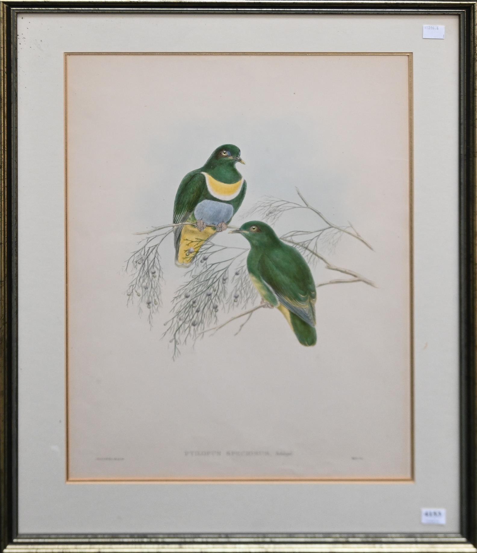 JOHN GOULD, PTILOPUS SPECIOSUS, HAND COLOURED LITHOGRAPH WITH TEXT PIECE VERSO, 52.5 X 36CM (REVEAL), FRAME SIZE: 69 X 51CM
