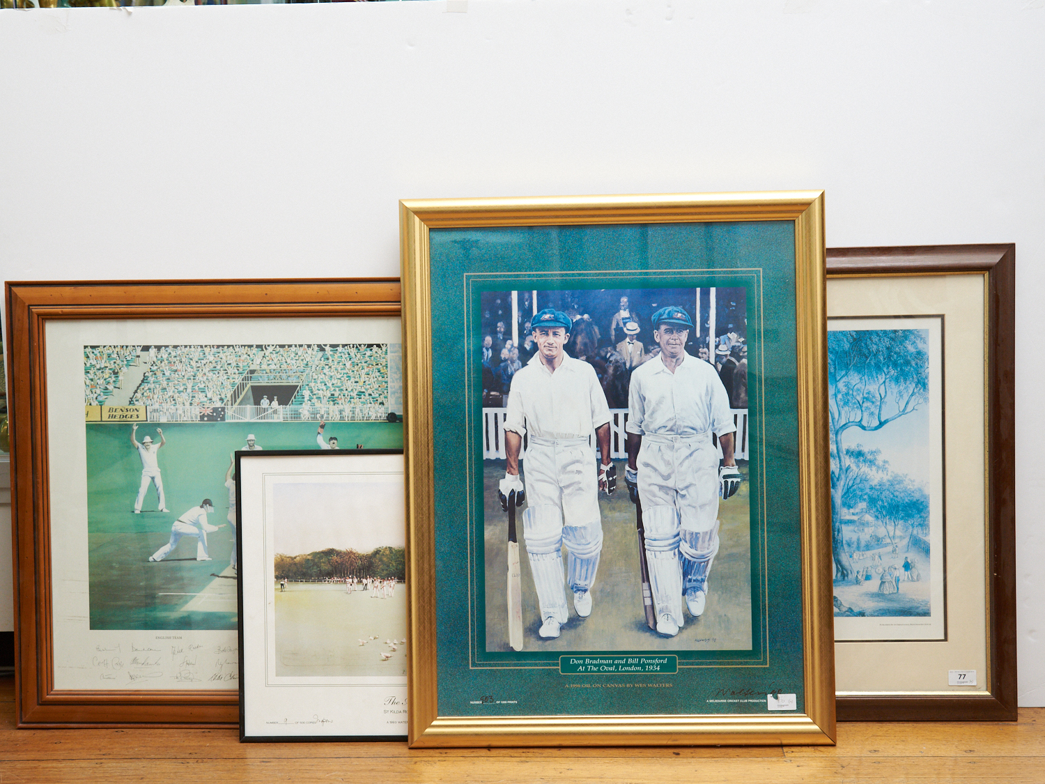 A GROUP OF THREE CRICKET MEMORABILIA PRINTS INCLUDING THE ALL ENGLAND ELEVEN VERSUS THE VICTORIAN TWENTY-TWO, MELBOURNE CRICKET GROUNDS; THE ASHES CENTENATY PRINT AND THE ALBERT GROUND (A/F), LEONARD JOEL DELIVERY SIZE: X-LARGE