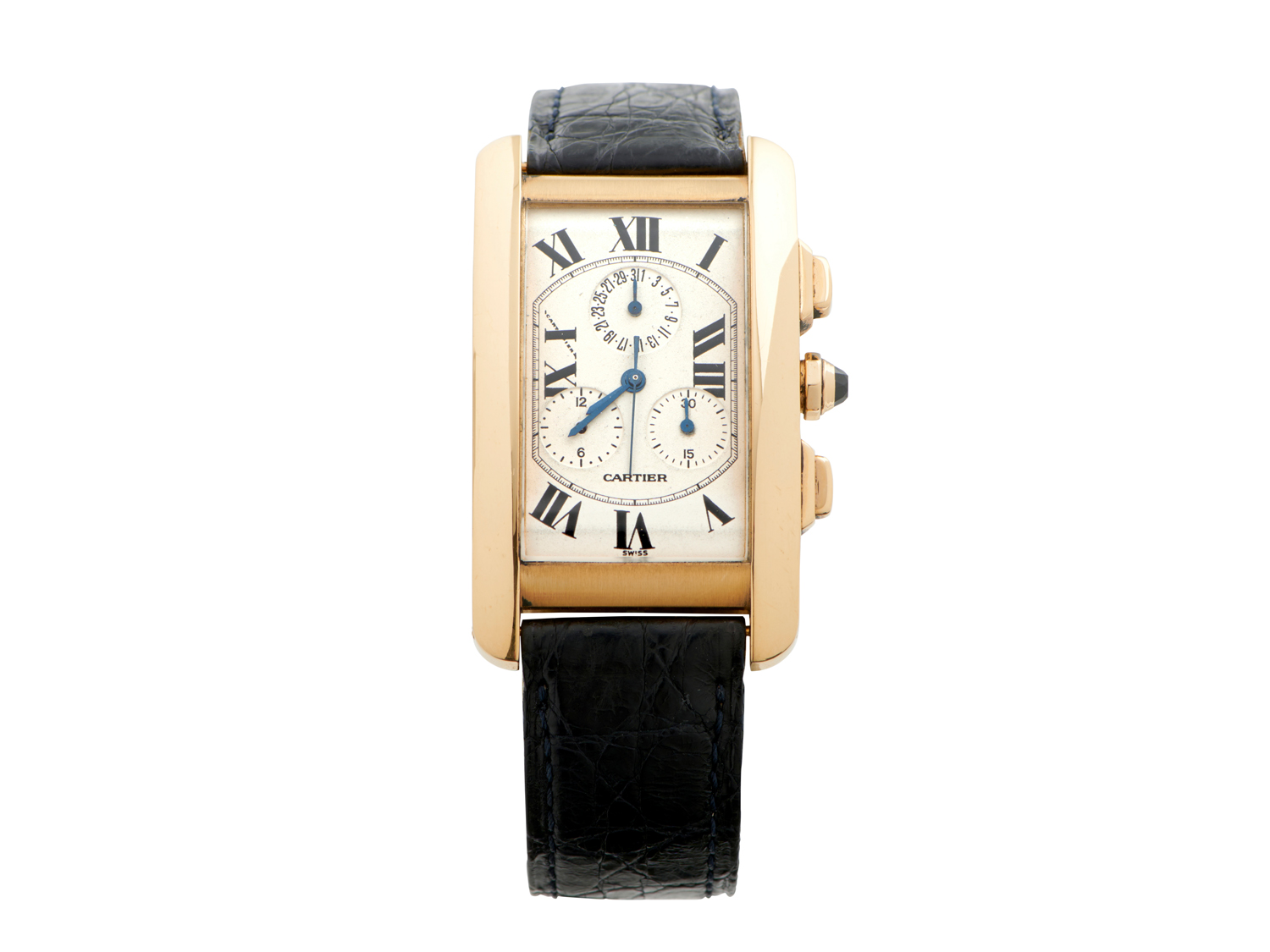 Closure: Cartier black leather strap and 18ct gold folding clasp