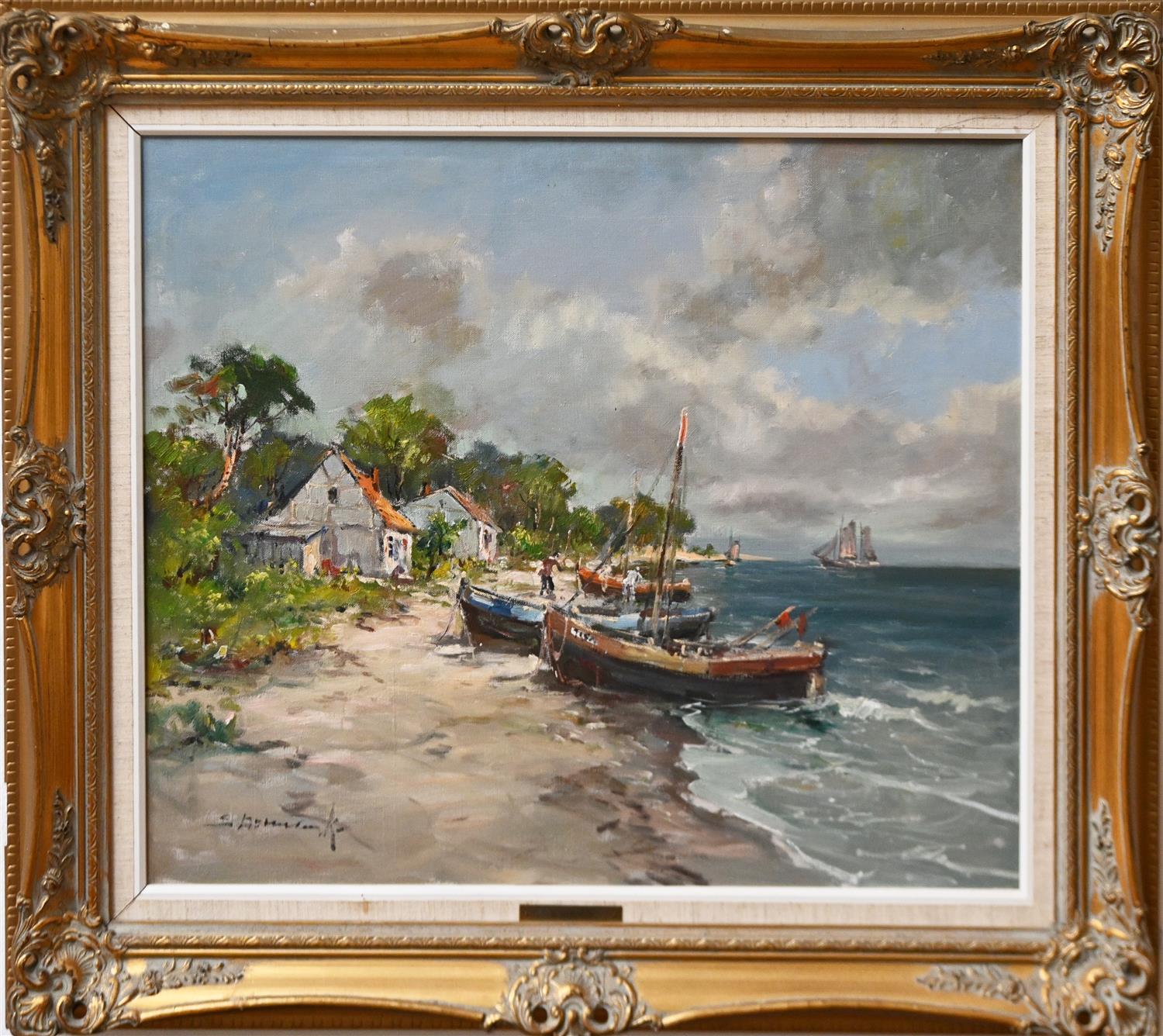 SIGNED E. DIRKSEN, (BOAT SCENE), OIL ON CANVAS, SIGNED LOWER LEFT, 50 X 60CM, FRAME SIZE: 68 X 79CM