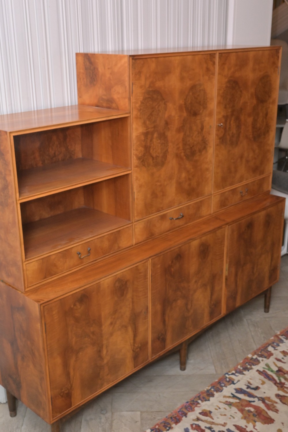 A SUBSTANTIAL 1950s DANISH WALL UNIT / SIDEBOARD, THE EXTERIOR IN BOOK-MATCHED FIGURED WALNUT VENEER (A/F) (179H X 194W X 50D CM) (THIS HEAVY ITEM MUST BE REMOVED BY CARRIERS AT THE CUSTOMER'S EXPENSE. LEONARD JOEL STAFF WILL NOT ASSIST CARRYING THIS ITEM) (X-LARGE ITEM)