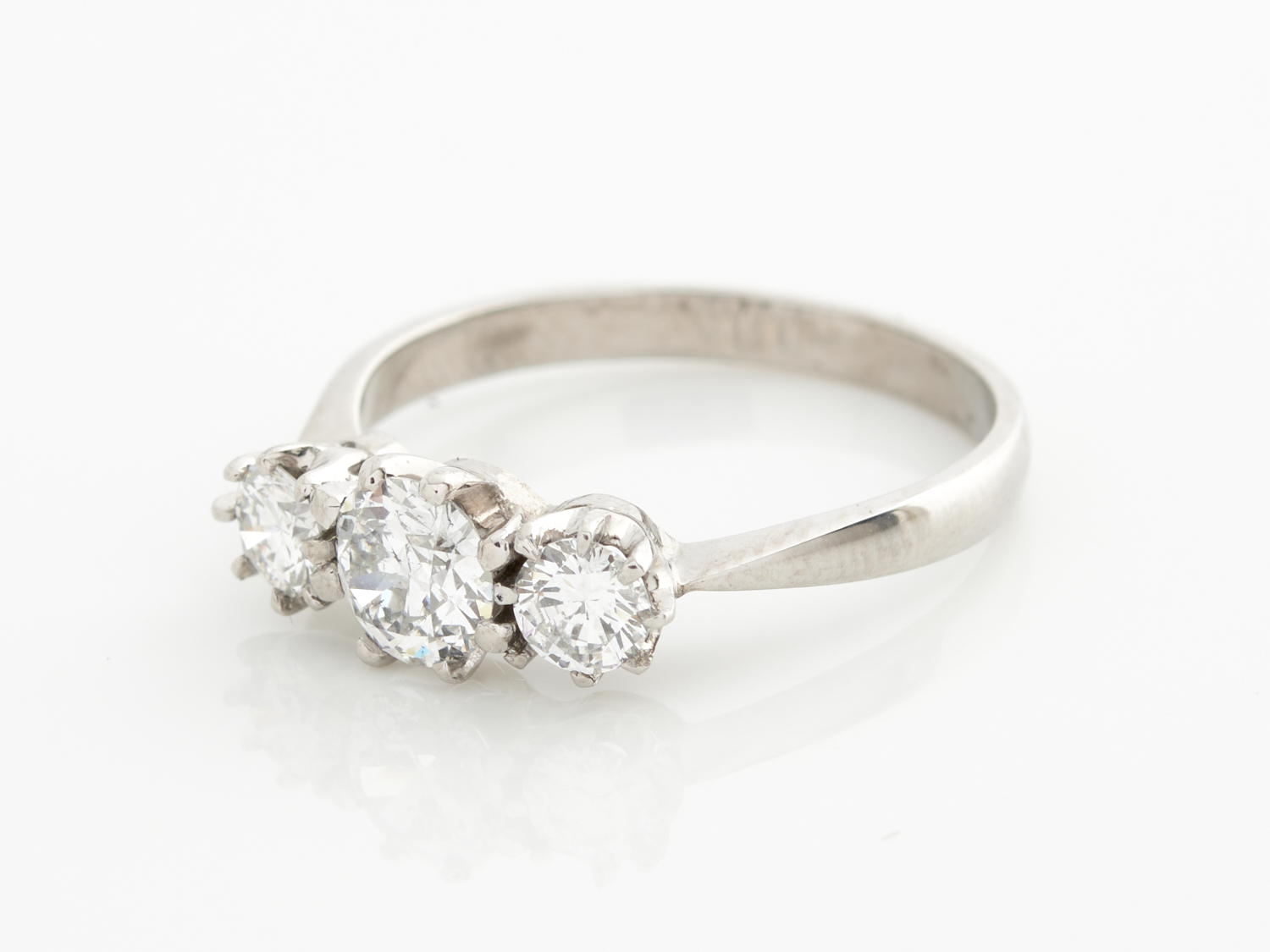 A THREE STONE DIAMOND RING IN 18CT WHITE GOLD, THE DIAMONDS TOTALLING APPROXIMATELY 0.90CTS, SIZE N